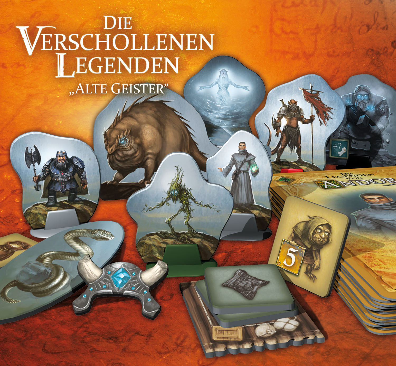 Man erkennt auf jeden Fall den Arbak und die Gestalt im grauen Mantel wird wohl Meres sein, in C+T hat eine ähnliche grüne Flamme in der Hand. Das seltsame, große, braune Vieh mit den blauen Augen kann ich noch nicht einschätzen, aber der Zwerg wird wohl etwas mit dem "lang gehüteten Geheimnis im Innern des Grauen Gebirges" zu tun haben. Bleiben noch der braune Beutel (der kann alles sein), die Schlange und der (zwergische?) Helm, die man ausrüsten kann, und das Floß mit den Stein-/Erzplättchen, was vielleicht etwas mit "niedergebrannten Gehöften" zu tun hat, die man wiederaufbauen muss. Die graue Seite lässt darauf schließen, dass man sie mischen kann und sich auf der Rückseite etwas befindet, womöglich unter anderem dieses seltsame kleine Wesen (Gnom?) mit der fünften Stunde neben sich?
