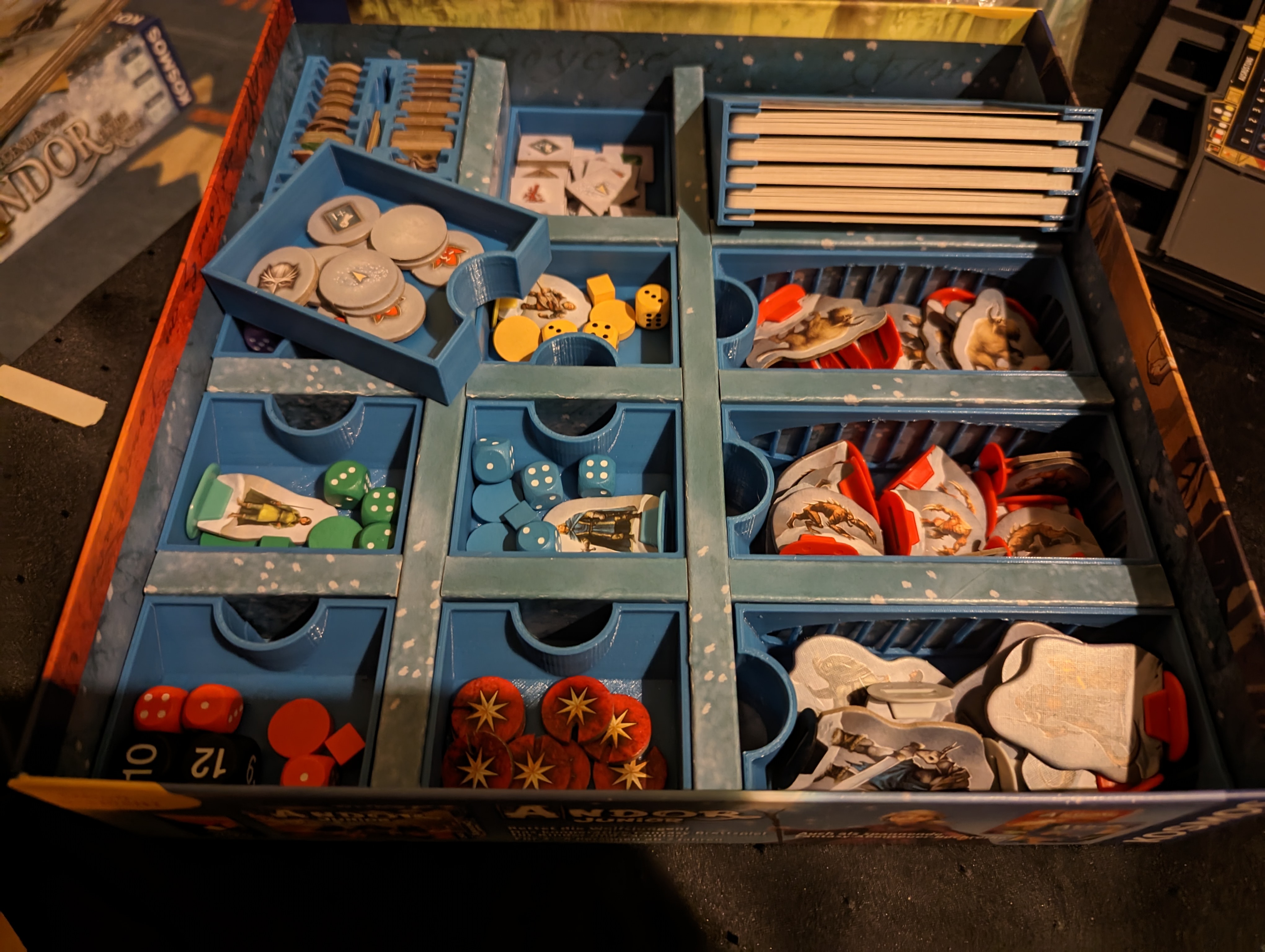 schon seit längerem beschäftige ich mich mit der Frage, wie ich meine Andor-Teile am besten sortiere. Deshalb habe ich jetzt ein Inlay für das Grundspiel und für die Reise in den Norden aus Holz gebaut, und weil ich kein passendes Thema gefunden habe, eröffne ich jetzt einfach ein neues. Vielleicht hat ja jemand ein ähnliches Vorhaben wie ich und kann die Bilder als Inspiration nutzen.