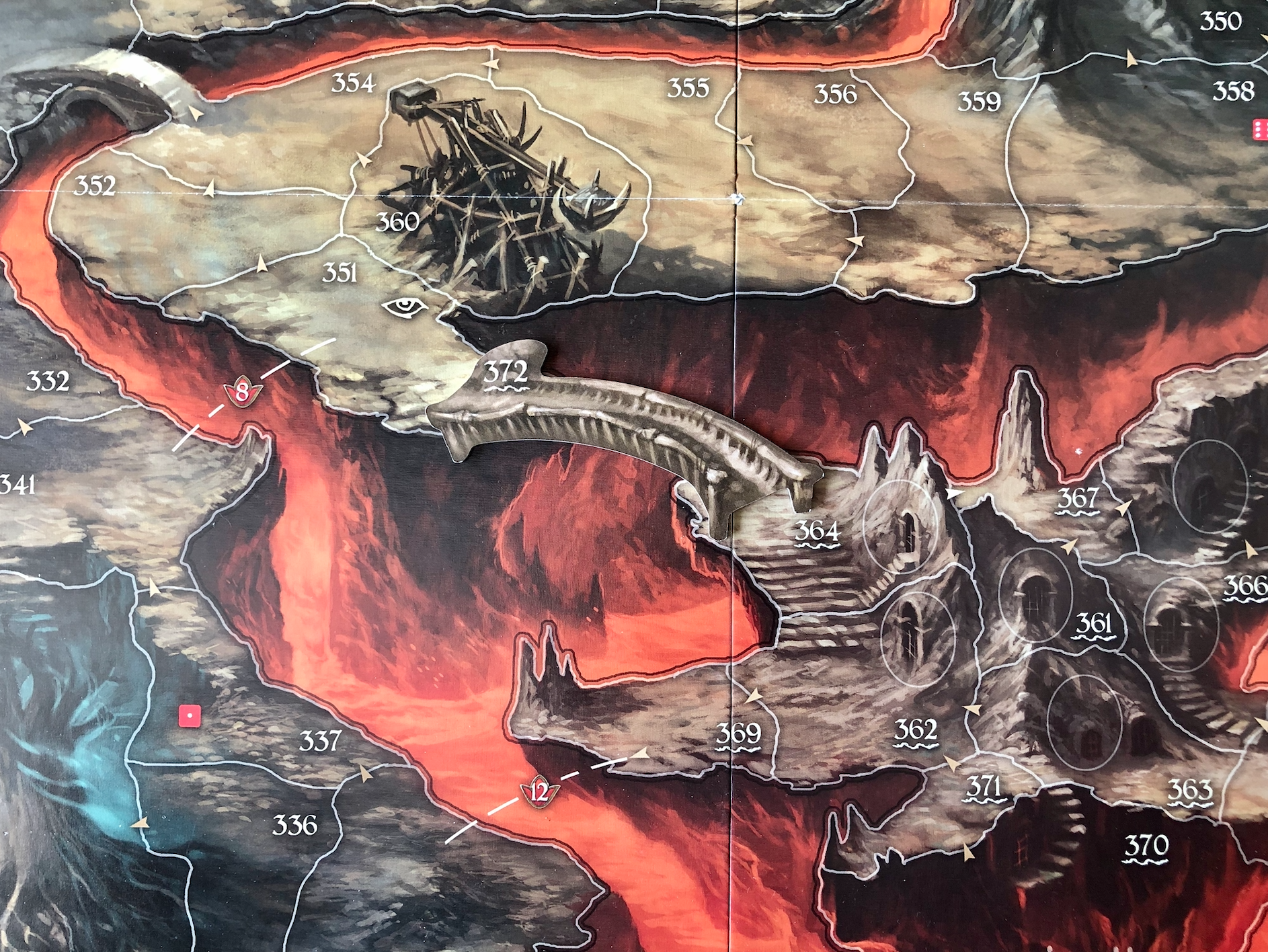 Bei 206 ist es noch relativ eindeutig, da nur die Felder 205 und 207 miteinander verbunden werden. Auf der Spielplanrückseite ergibt sich, je nach Platzierung, auch die Möglichkeit auf das Feld 355 zu gehen. OK, das steht so nicht im Text, also spielt man es so nicht. Ist aber unschön, wo der Spielplan doch so ansehnlich ist.