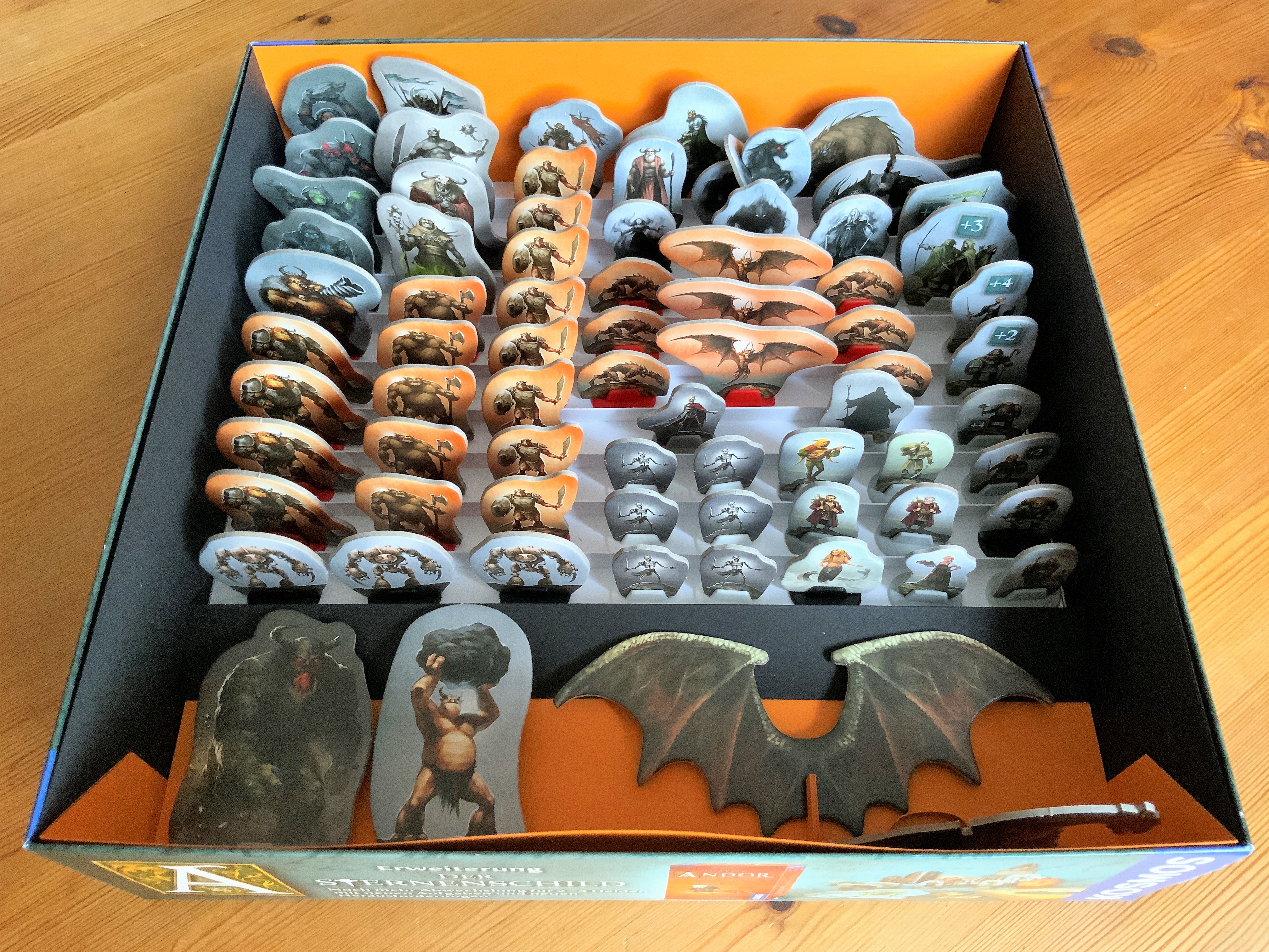 - Die Bonusbox als Bewahrer der Helden. Die großformatigen Heldentafeln von Thorn und Bragor sind unter den übrigen untergebracht, die meisten Heldenfiguren liegen griffbereit, die Zwerge können in dieser flacheren Box aufrecht stehen; außerdem sind hier die Begleiter der Helden versammelt.