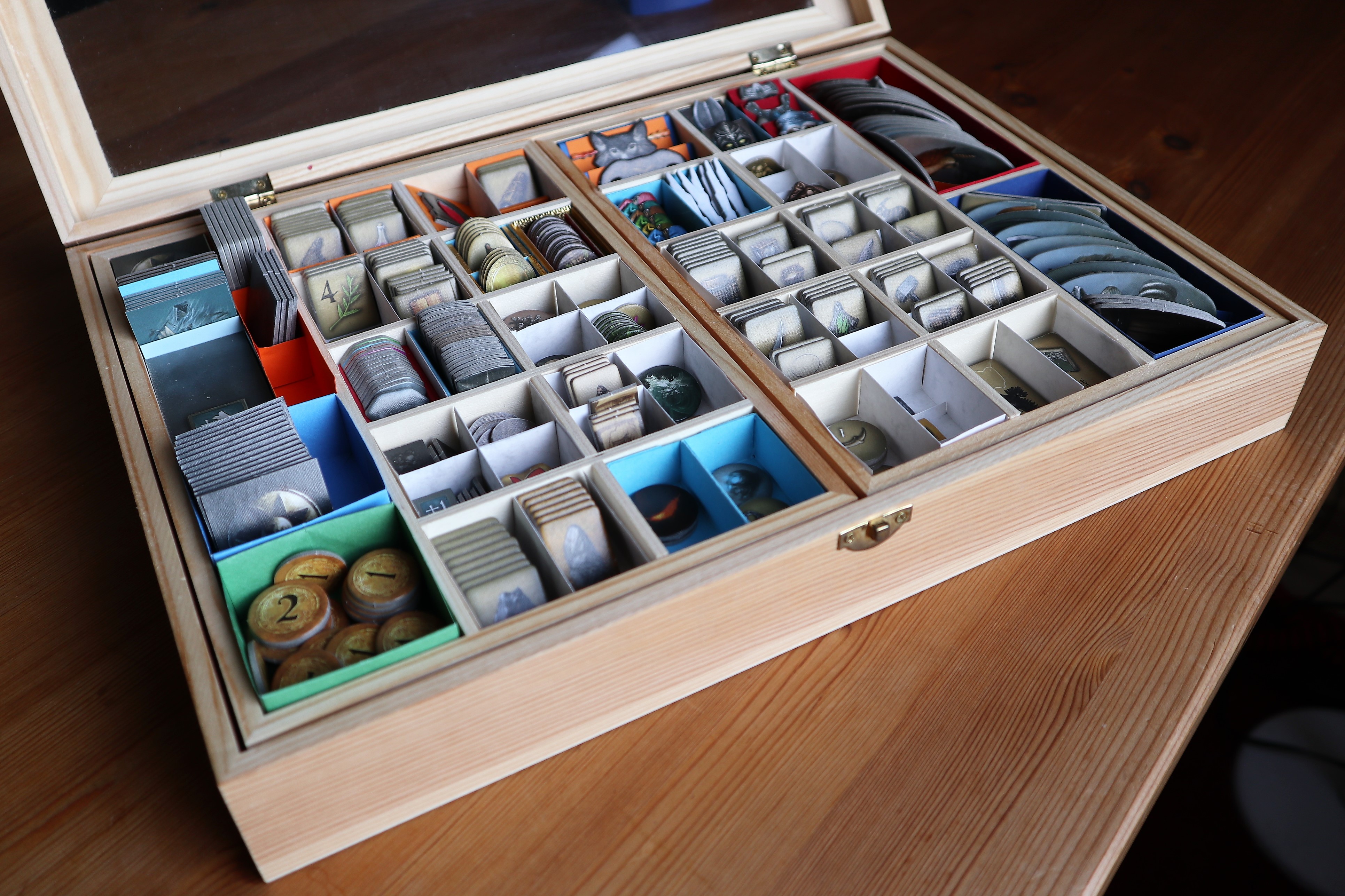- Ein Holzkasten mit Fächern, zweilagig, die ich noch eigens unterteilt und eingerichtet habe.