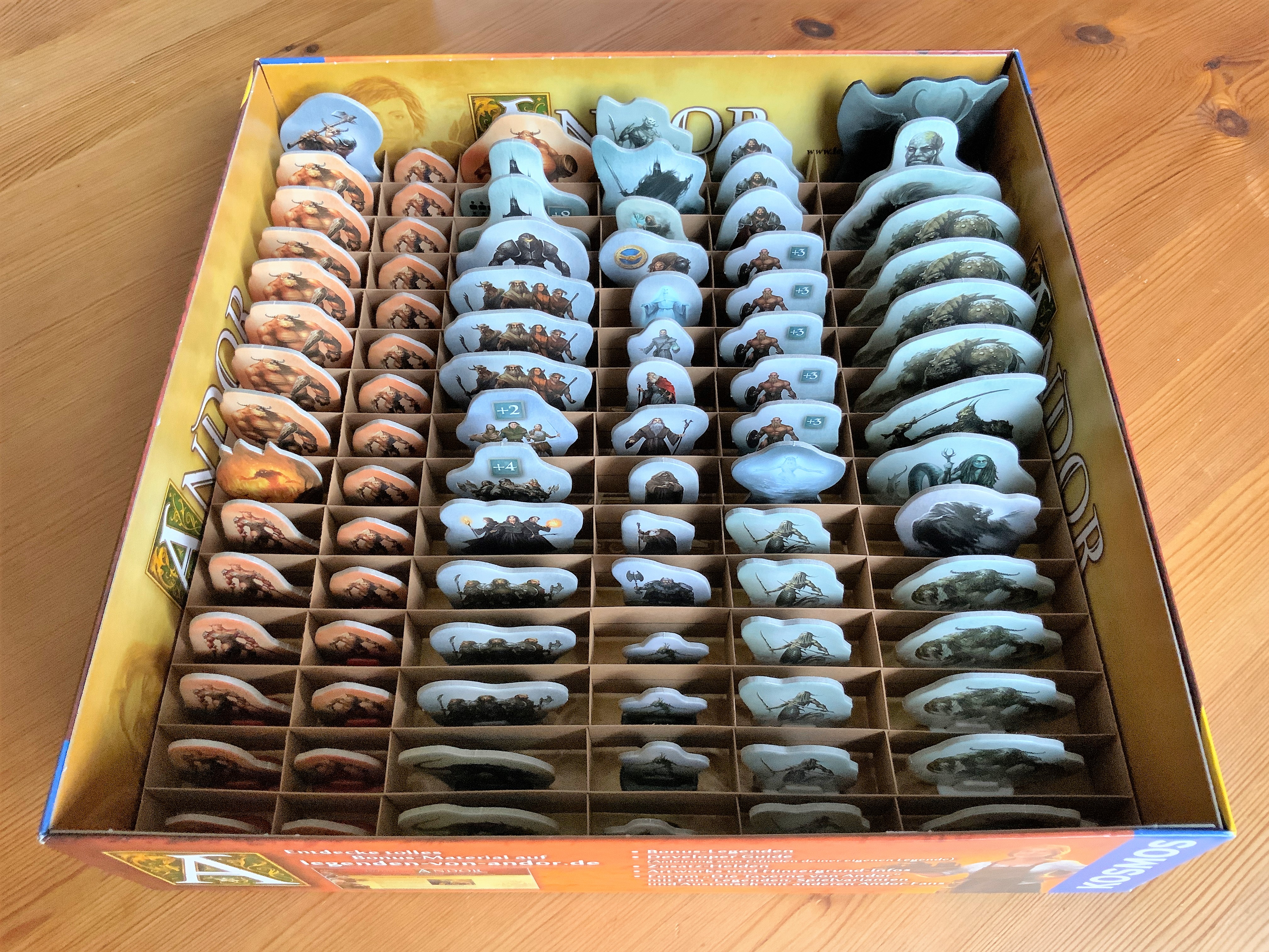 - Die Bonusbox als Bewahrer der Helden. Die großformatigen Heldentafeln von Thorn und Bragor sind unter den übrigen untergebracht, die meisten Heldenfiguren liegen griffbereit, die Zwerge können in dieser flacheren Box aufrecht stehen; außerdem sind hier die Begleiter der Helden versammelt.