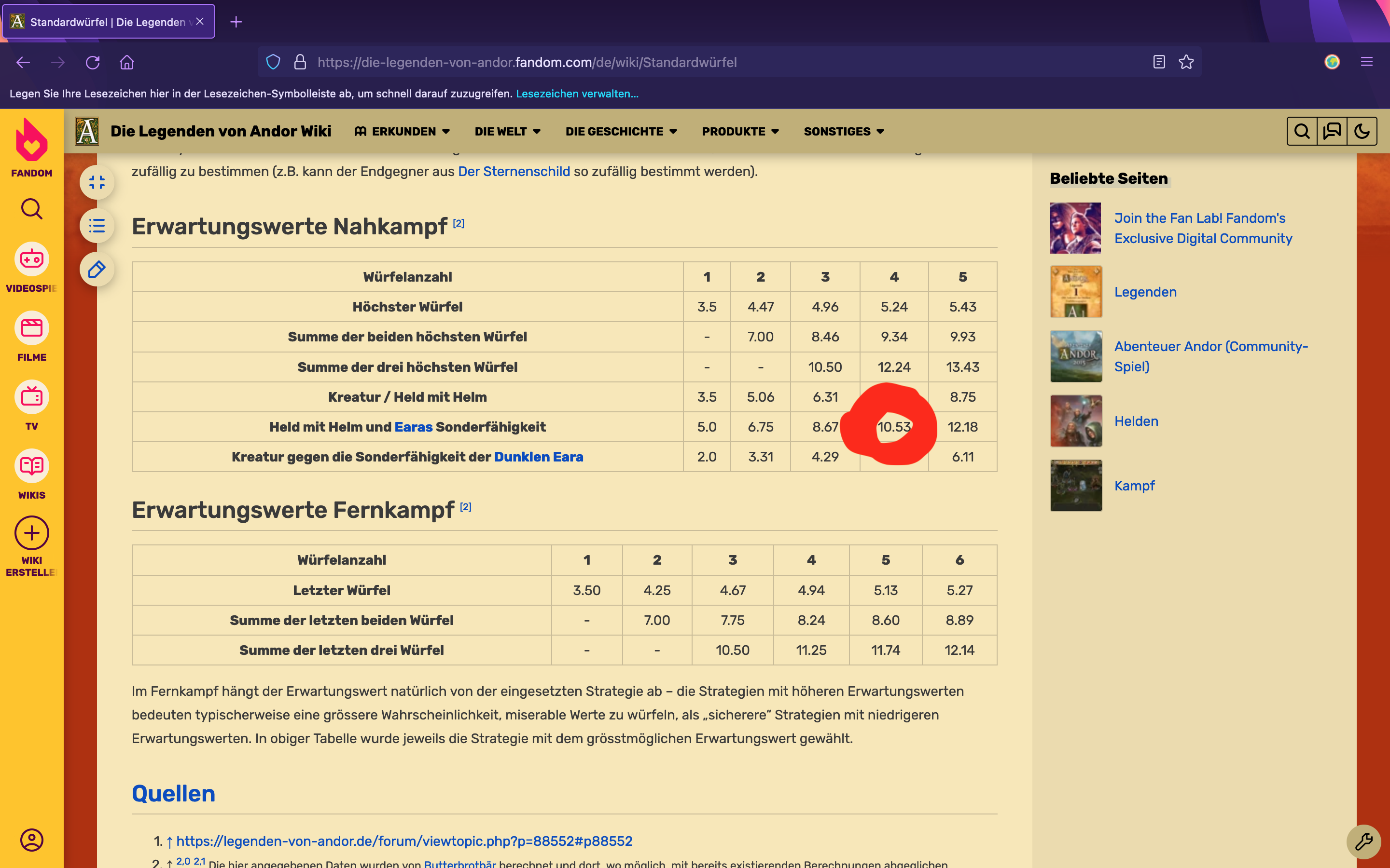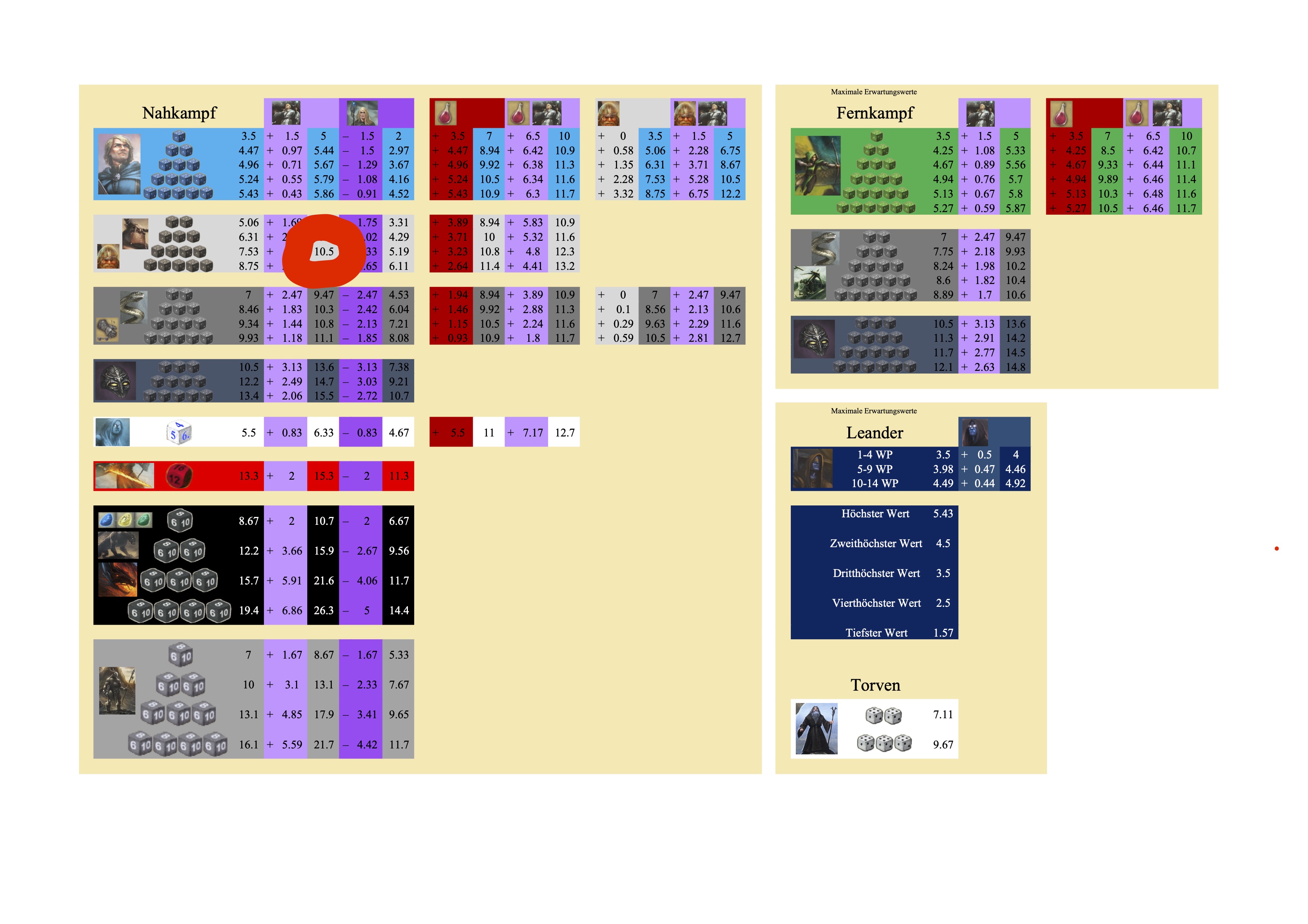 Hier ist eine von mir erstellte Tabelle zu den Würfelwahrscheinlichkeiten. An Epaminaidos‘ Tabelle wird sie nicht ankommen – meine Berechnungen sind meistens erheblich uneleganter – aber es hat Farben und Bildchen und ich habe gerne daran gearbeitet und würde sie jetzt gerne in der Taverne teilen.