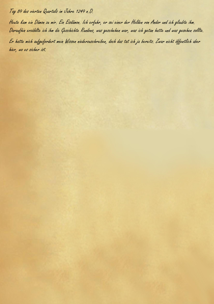 Es schneite. In einer kleinen Hütte nahe einem gefrorenen Fluss saß ein alter Mann. Er würde in einem Tag 203 Jahre alt werden. Er dachte an all seine Freunde zurück, an alles, was er erlebt hatte. Er hatte Viele sterben sehen und würde selbst bald sterben. Er hätte bereits seit über 60 Jahren tot sein sollen. Auch wenn die Thorne alt wurden, so alt auch wieder nicht. Nachdem Rastak plötzlich gestorben war, war Panik ausgebrochen. Es hatte alles so gut ausgesehen, nachdem er die Schlacht der Krahder überlebt hatte und seine Wunde doch geheilt war. Da traf es die Bevölkerung wie einen Schlag, als man hörte, er sei an den Nachwirkungen der Kämpfe zusammengebrochen. Eine faule Lüge, aber was hätte man den Leuten sagen sollen? Die Wahrheit? Dass ihr König von einer unbekannten Person vergiftet worden war? Von mir. Ich hatte es getan, weil er mich darum bat. Er wusste, wie gut ich mich mit Kräutern auskannte. Er war des Lebens leid geworden. War es das, was das Volk wirklich hören wollte, oder waren sie mit der Lüge nicht doch besser davongekommen? Nicht einmal seinen eigenen Sohn hatte er eingeweiht. Und dieser ist ja nun auch weg. Seit dem Verschwinden von Ragomiter und Argwydd ist ein Machtvakuum ausgebrochen. Nun wird die einst so stolze Nation Rundon von einem Haufen alter fettgefressener Barone und Fürsten regiert. Was ist aus diesem Land geworden? Ich verstehe nicht mehr, was noch zu tun ist. Warum erzählt ihr mir das? Warum jetzt, warum mir? Der Alte schreckte hoch und sah sein Gegenüber lange an, bevor er antwortete. Weil ich hoffe, dass du aus meinen Fehlern lernen kannst. Damit die Geschichte dieses Landes nicht vergessen wird. Ach, es gibt viele Gründe. Dann solltest du dir überlegen, warum nur ich sie höre. Nutze dein Wissen und mach die Welt ein bisschen besser. Schreibe auf, was du weißt. Nach dem Tod von Lifornus braucht Rundon jemanden, der seine Chronik weiterführt. Sei du diese Person. Vielleicht hast du recht. Ja, das werde ich tun. Ein Lächeln umspielte die Lippen des alten Mannes. Sein Gegenüber erhob sich und verließ die kleine Hütte. Kaum war er nach draußen getreten, hörte es auf zu schneien und aus dem Schnee und dem Eis formte sich ein Schwert in der Hand des Fremden, dessen Haut nun blau zu schimmern begann.