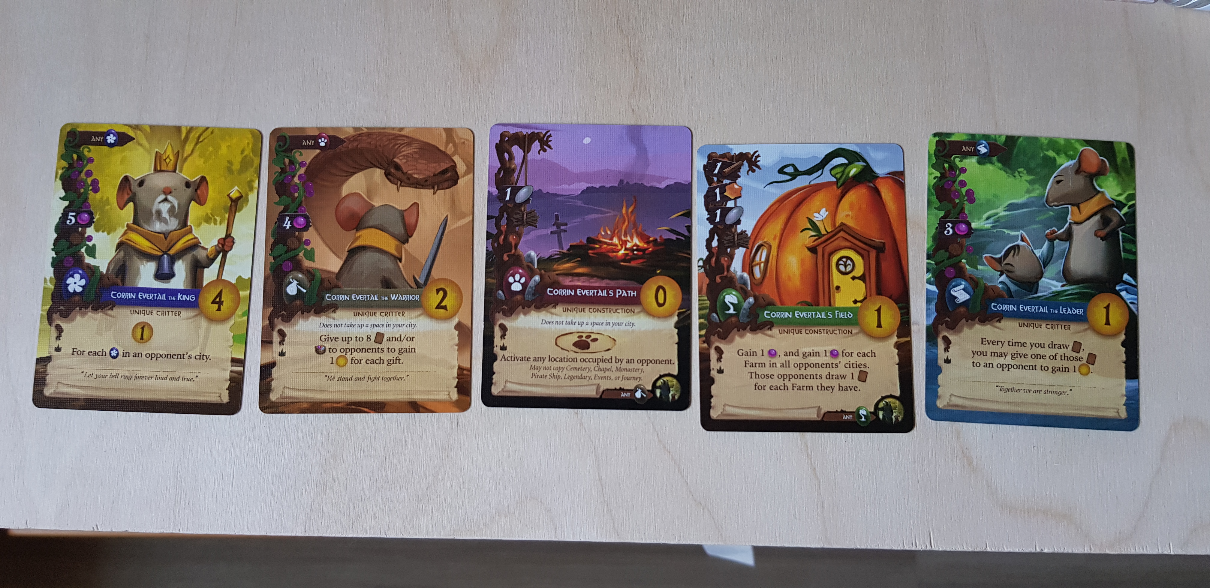 Was anderes: ich habe noch mal eine Partie Everdell gespielt, mit den Schweinen, den Schnecken und den Schmetterlingen, weil ich da noch was besser zu spielen hatte. Ich habe mit Newleaf als Erweiterung gespielt, und ich habe (neben den Player Powers) noch mit Legenden gespielt und jedem verdeckt eine Corrin Evertail Karte zugeteilt.