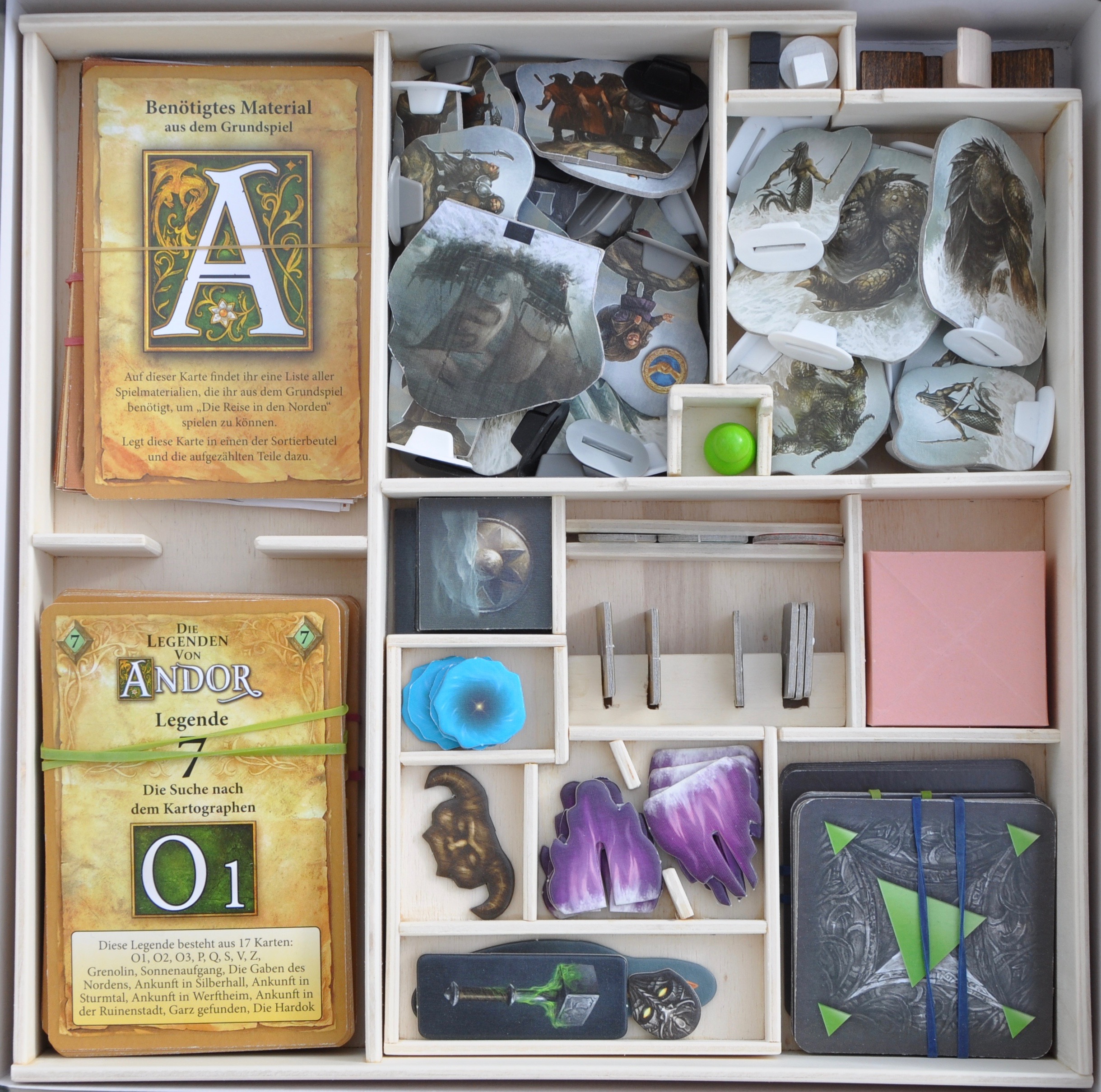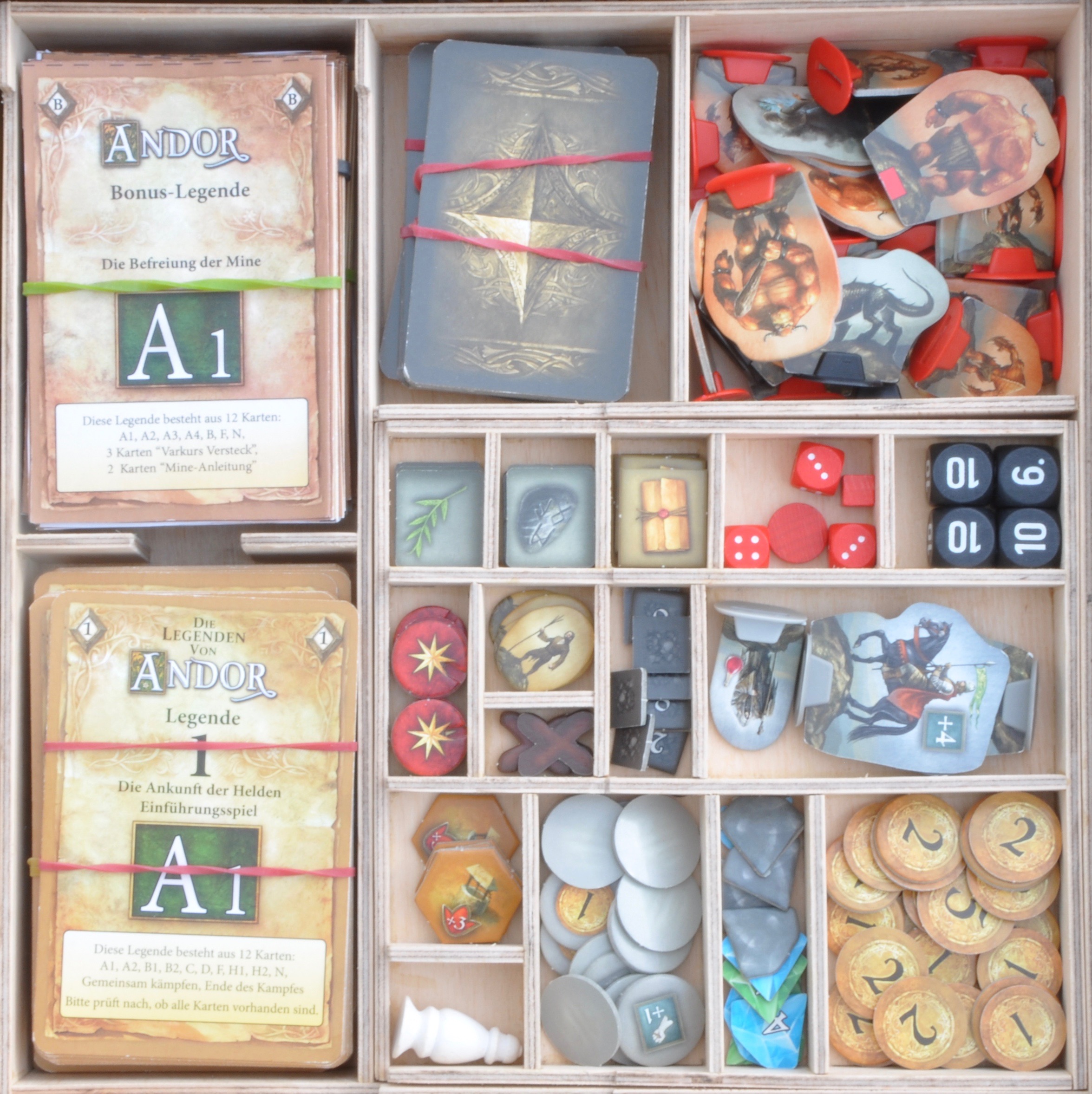 schon seit längerem beschäftige ich mich mit der Frage, wie ich meine Andor-Teile am besten sortiere. Deshalb habe ich jetzt ein Inlay für das Grundspiel und für die Reise in den Norden aus Holz gebaut, und weil ich kein passendes Thema gefunden habe, eröffne ich jetzt einfach ein neues. Vielleicht hat ja jemand ein ähnliches Vorhaben wie ich und kann die Bilder als Inspiration nutzen.