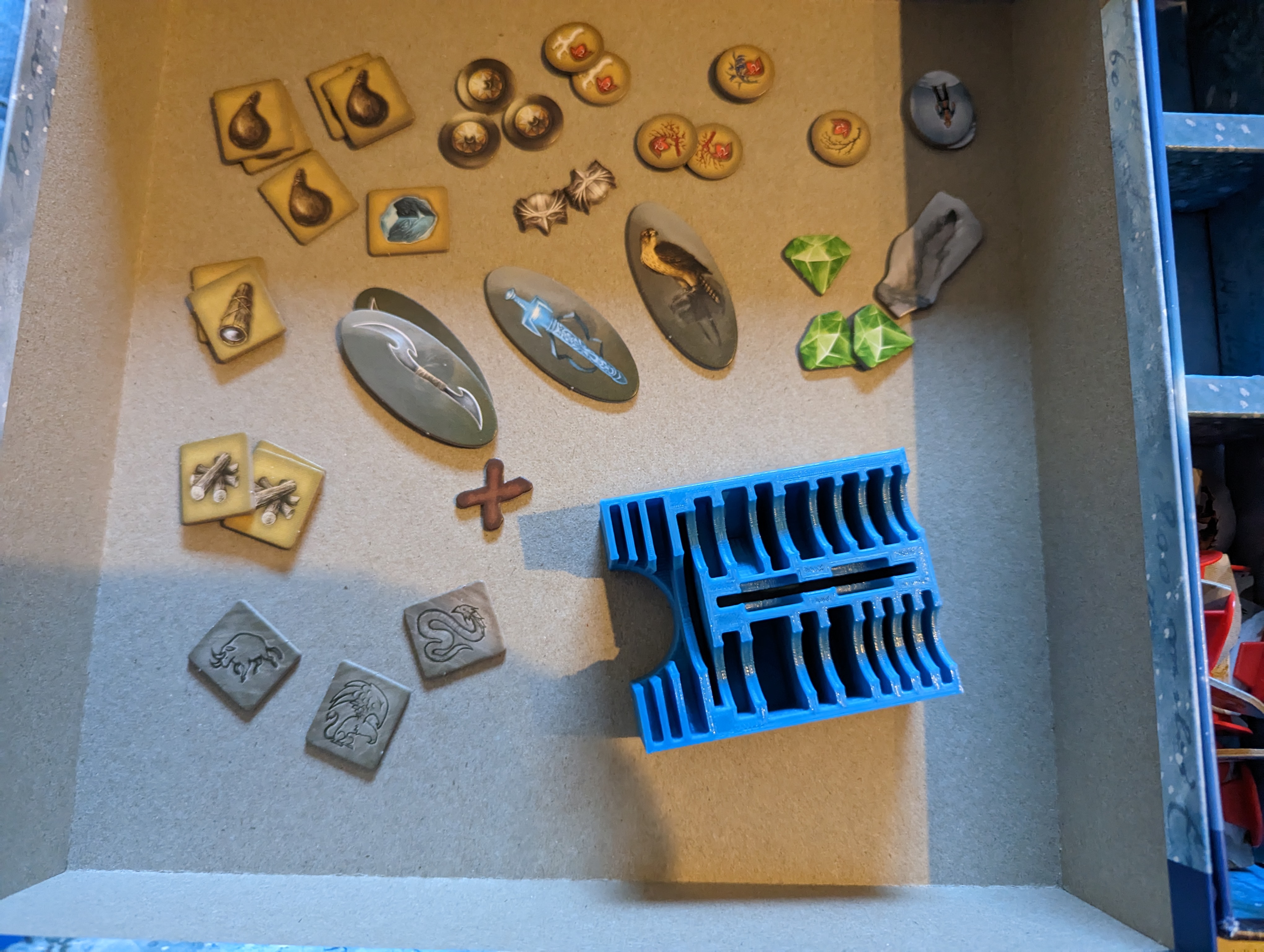 Ich habe mehrere kleine Sortierkästen gebaut, die in das große Inlay eingesetzt werden. Die Abstufungen links habe ich gesägt, damit die Heldentableaus und die Ausrüstungstafel gut in das Inlay hineinpassen (Ja, ich mag es, wenn alles haargenau zusammenpasst