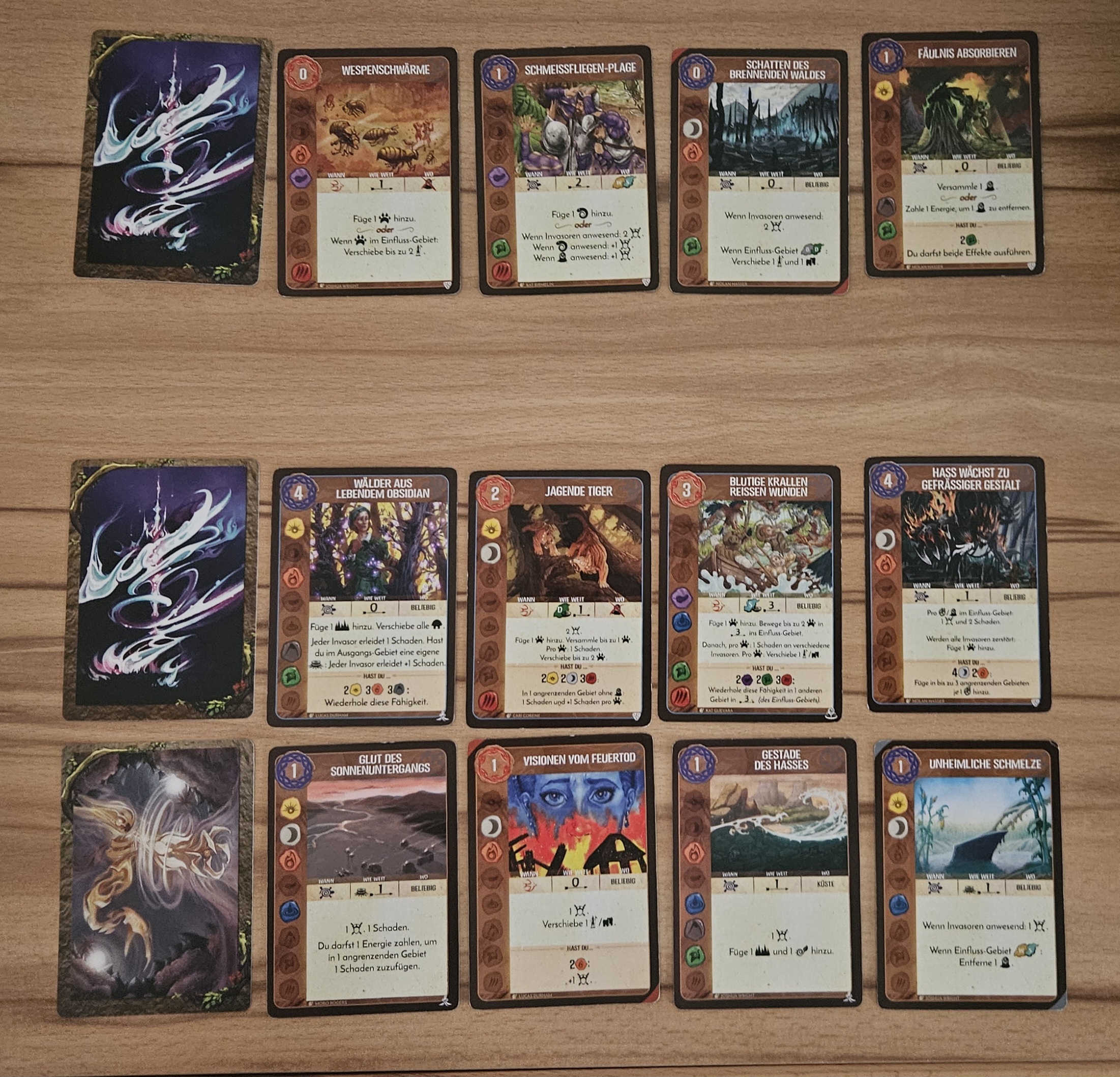 +1 Luftelement, +1 Energie, eine Präsenz von der oberen Leiste (für 2 Energie) nach E4 und eine neue Schwache Fähigkeit ("Visionen vom Feuertod") ziehen. Ich erhalte insgesamt +3 Energie und spiele 2 Karten aus.