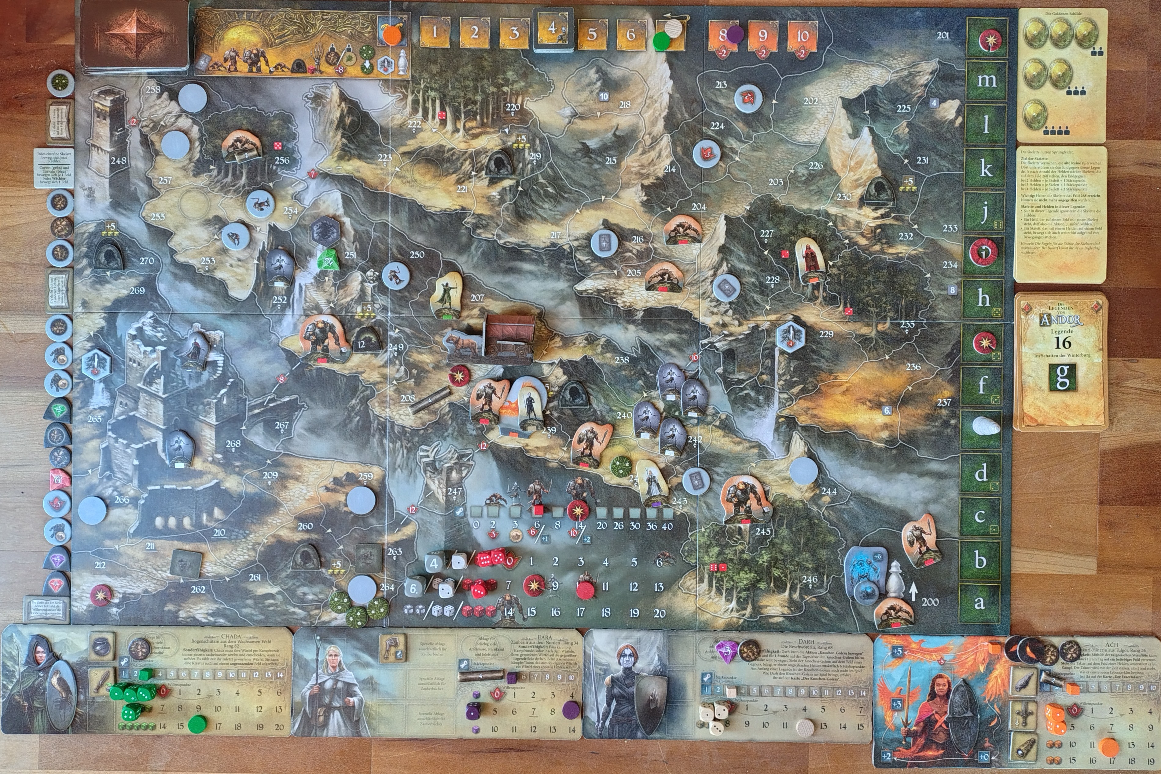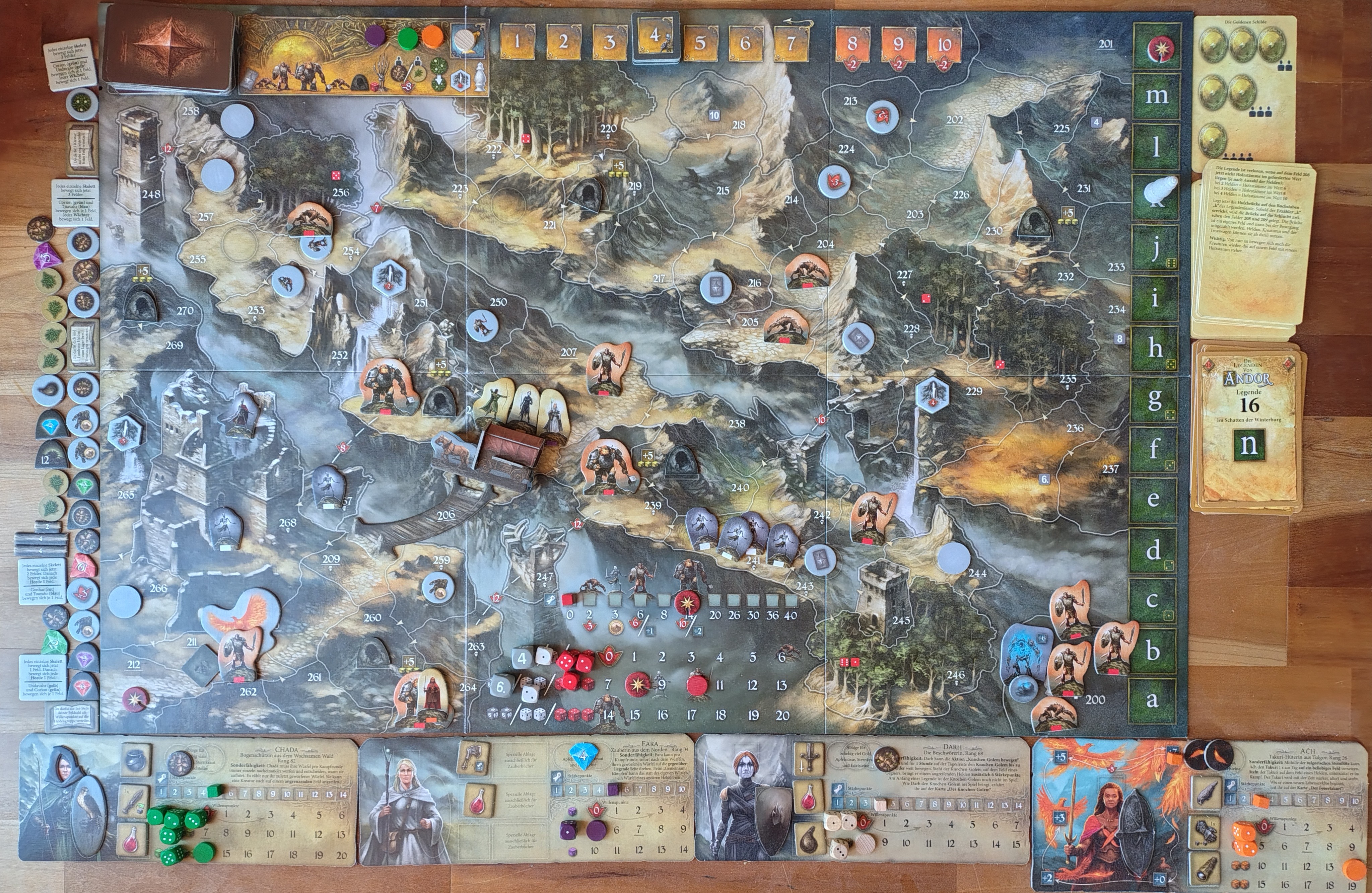 Chada schießt auf den Bergskral, Eara, Darh und Turr unterstützen. Chada lässt Pfeile niederregnen, alle meilenweit daneben. Schließlich hat Eara Mitleid und lenkt einen Pfeil ins Ziel: 4, 1, 2, 1, 1 -> 6. Eara hat ihre magische Energie nun natürlich für Chada aufgebraucht: 1. Auch Darh erbringt keine Bestleistung: 1, 3, 4 -> Kampfwert 29 Aber auch der Bergskral ist nicht in Form: 1, 2, 4 -> Kampfwert 10. Sieg in einer Kampfrunde (2.h + 2.h + 2.h)