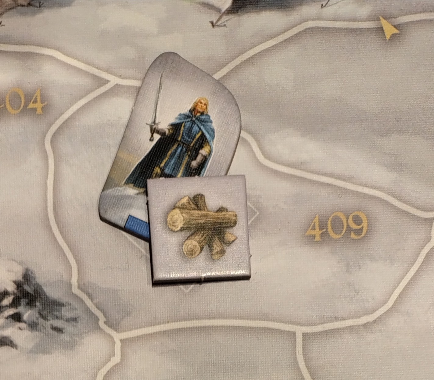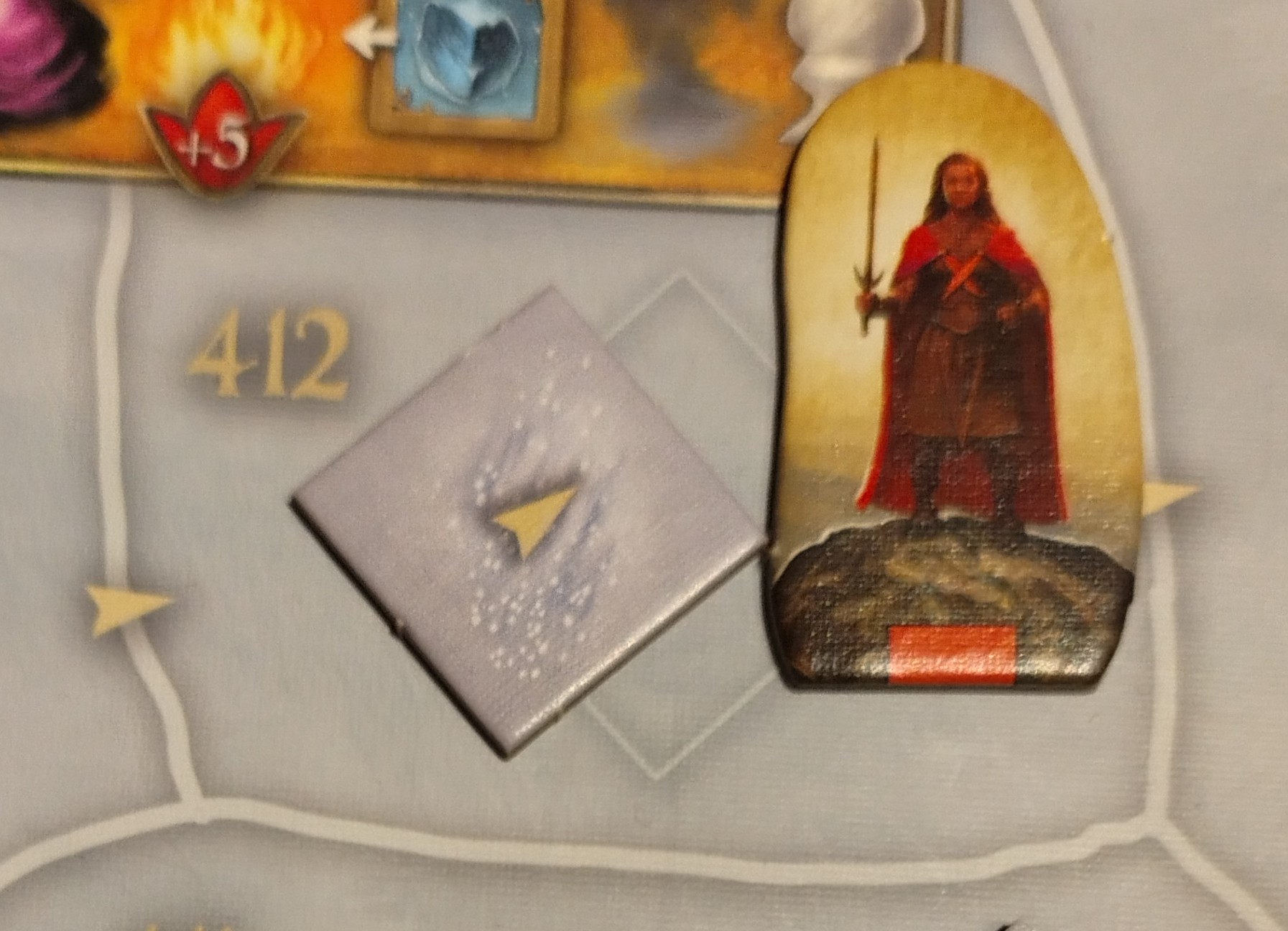 Es sind Zielmarker bei den Grehon, auf auf Feld 438 und in der Pfahlbausiedlung. Wenn wir so ein Feld betreten, wird eine Karte vorgelesen. Der Zielmarker wird dann wie ein Kraut eingesammelt und kann auch mit dem Falken verschickt werden. Wenn ein Held alle drei hat, wieder die Karte „Die Erkenntnis“ vorgelesen.
