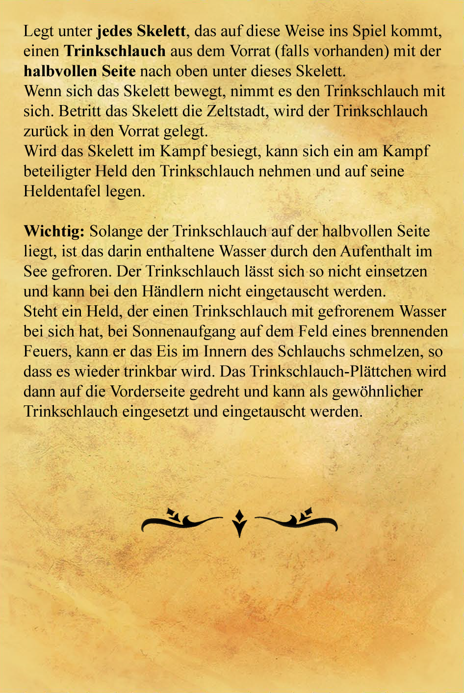 - Das Skelett von Feld 454 überspringt die Kreaturen so weit, dass es unmittelbar vor der Zeltstadt zum halten kommt. Anschließend taucht ein weiteres Skelett auf Feld 456 auf. Das dort befindliche Eisplättchen kommt unbesehen aus dem Spiel.