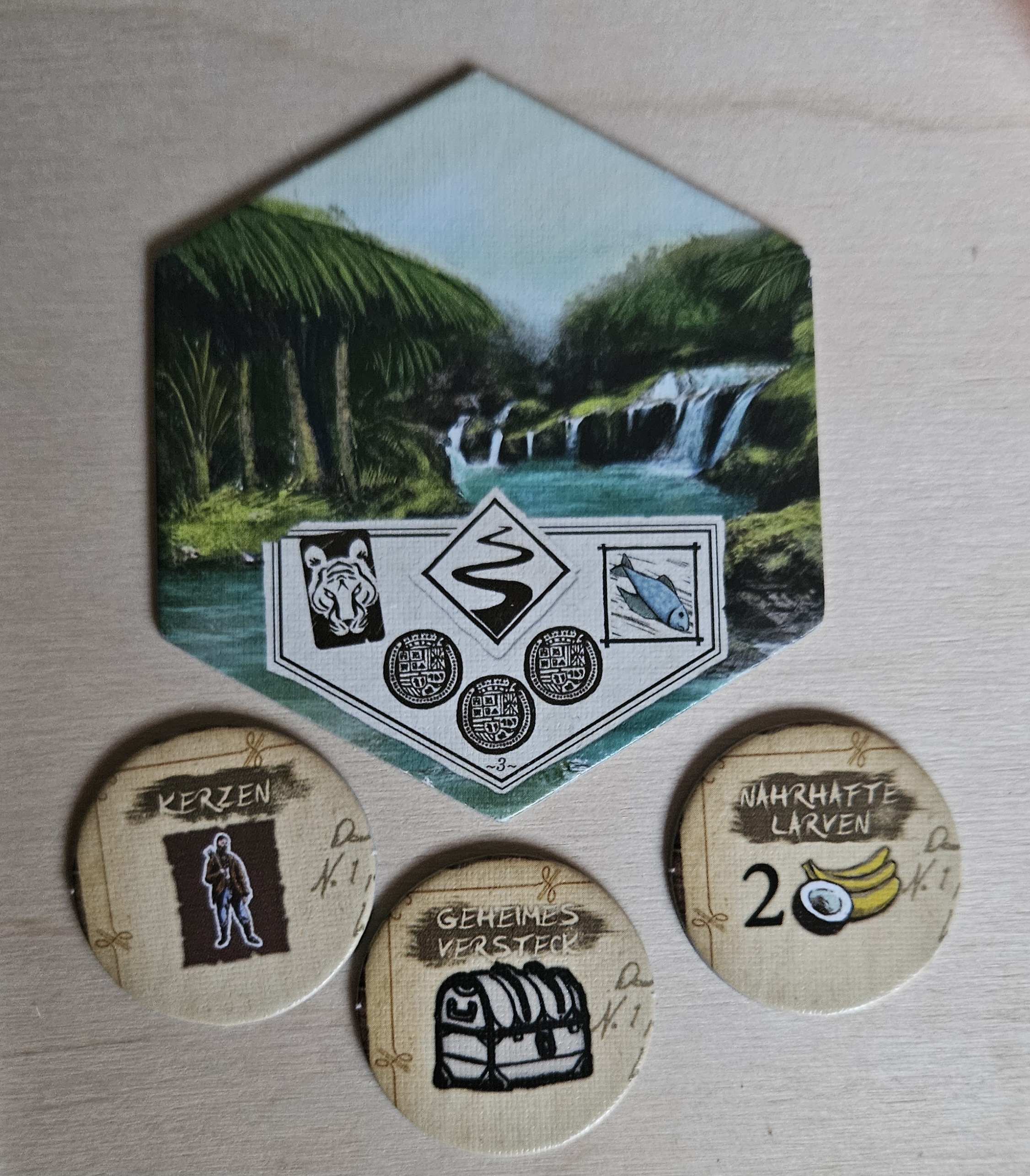Zu beachten wäre: beide Hügel haben ein Totem-Symbol. Gemäß der Übersicht auf der Szenariotafel erhält der Held, der eines dieser Inselteile aufdeckt und platziert, durch den "Altar des Todes" 2 Wunden.