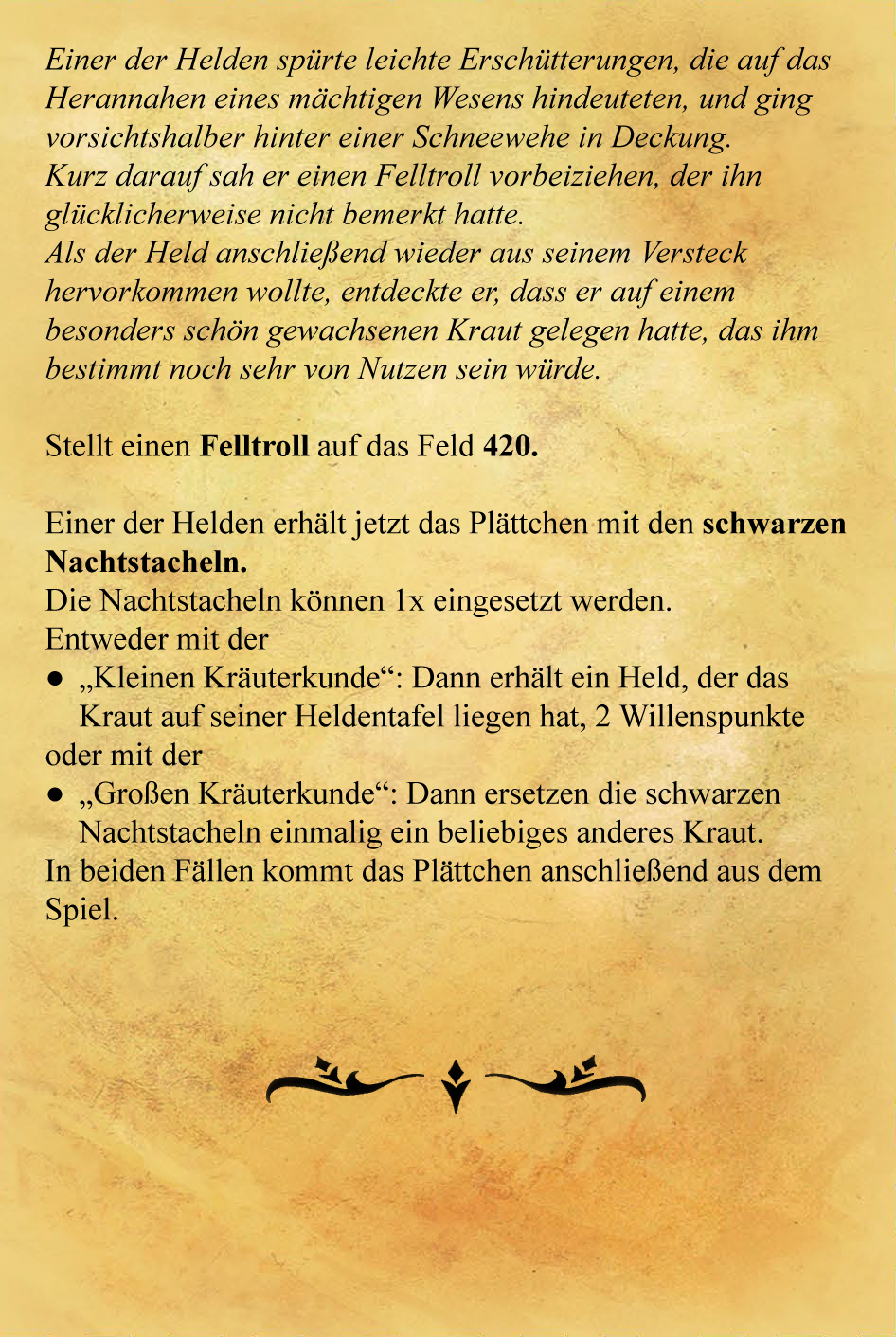 - Barz wanderte bis zum Knochenturm auf Feld 450 (7.h) und rettete den Hornfalken vor den Wilderern. Mit dem Fernrohr erspähte er auf Feld 449 ebenfalls Blaubachbeeren und auf 451 Brennholz. Dann schickte er das Fernrohr an Kram, der von seinem Feld aus den Schnee absuchte: Auf den Feldern 408 und 411 sah er jeweils 1 Schneesturm und auf 412 1x rotes Blutkraut.