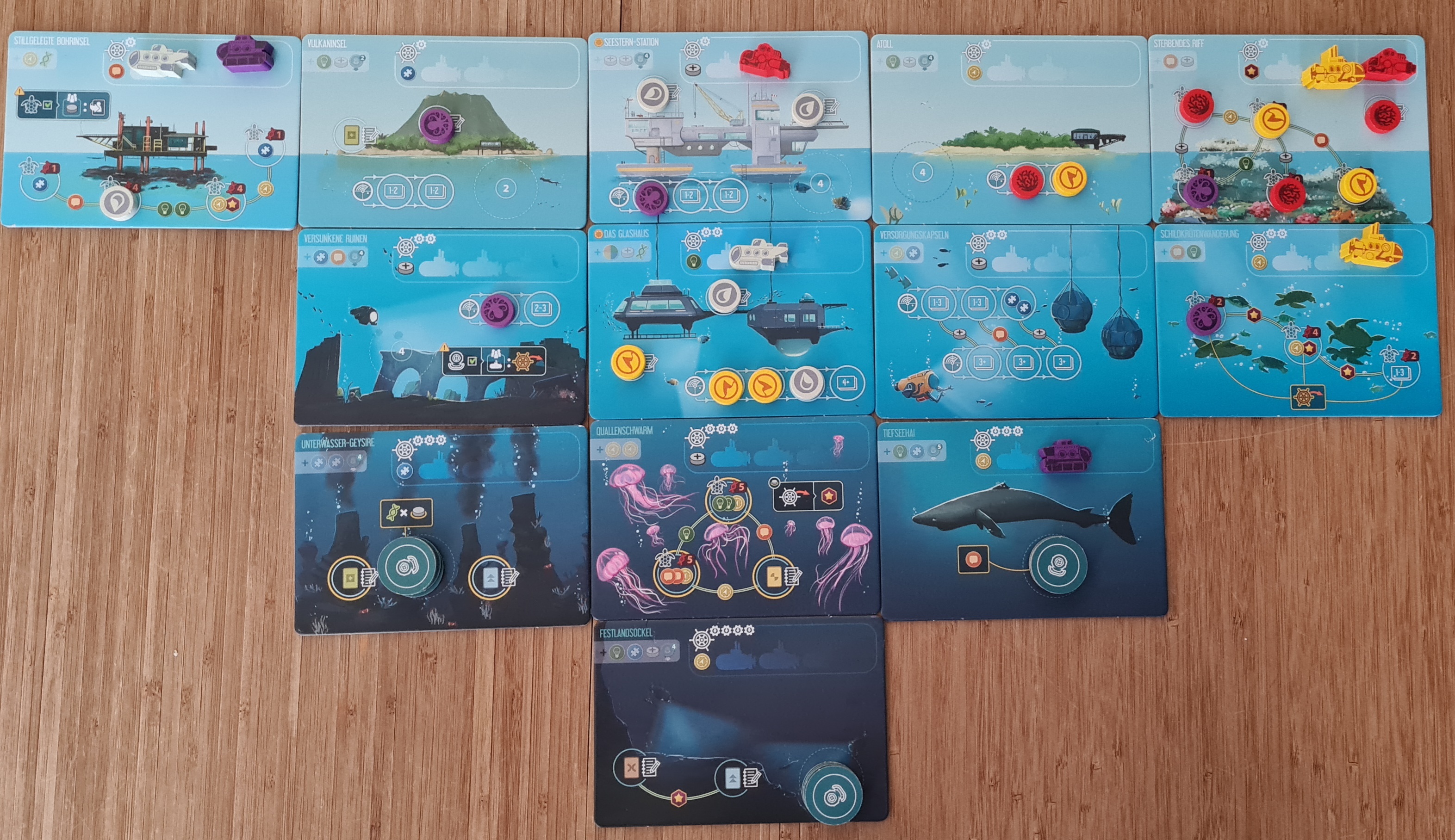 Die Tiefe 3 Zone mit den meisten Scheiben (aktuell null bei allen, glaub ich) wird zum Schutzgebiet erklärt. Wir müssen eine davon abwerfen und durch die oberste Tiefe 3 Zone ersetzen. Welche wollen wir auswählen? Es gibt den Tiefsee-Hai, die UW-Geysire oder den Vortex.