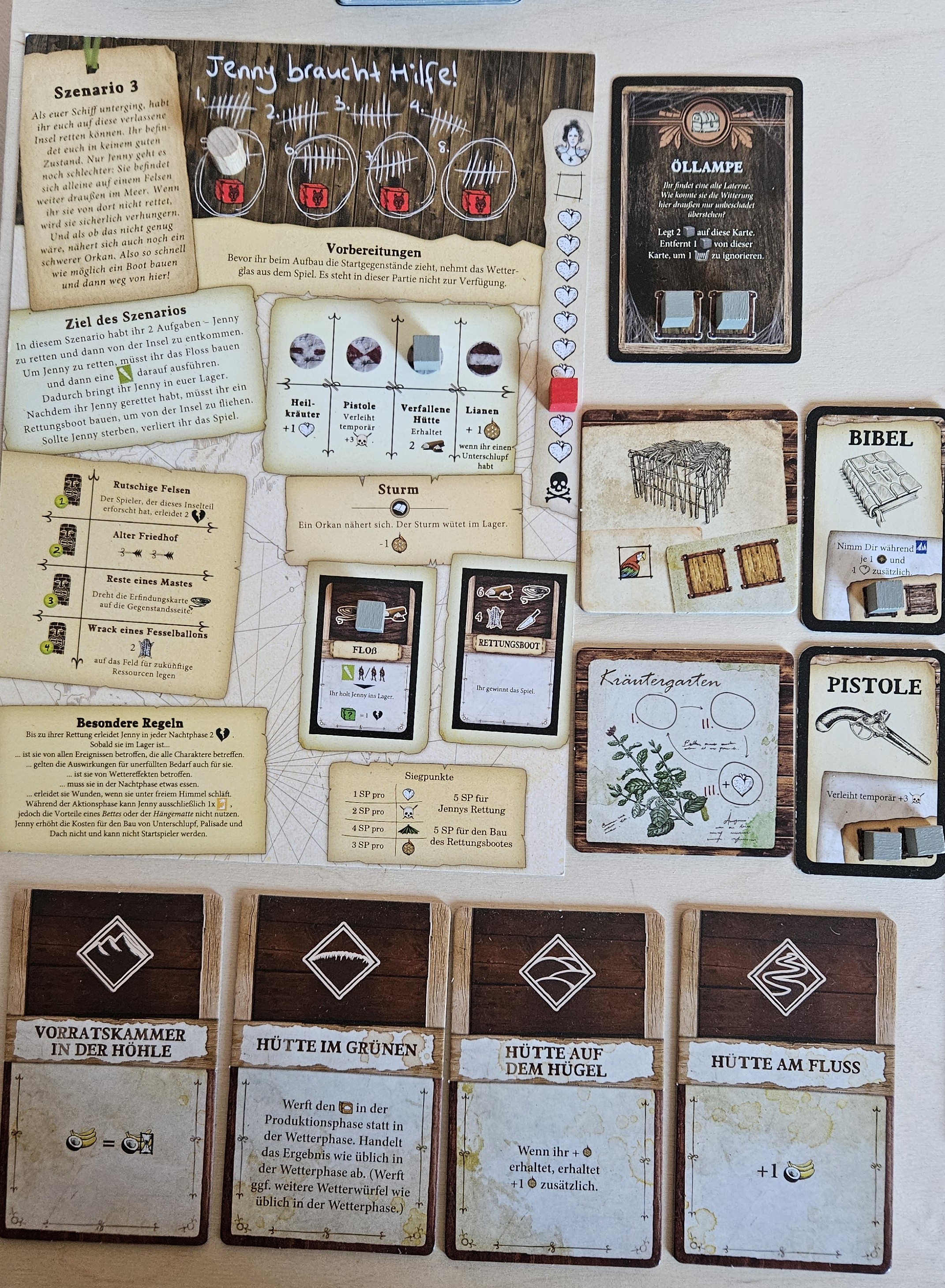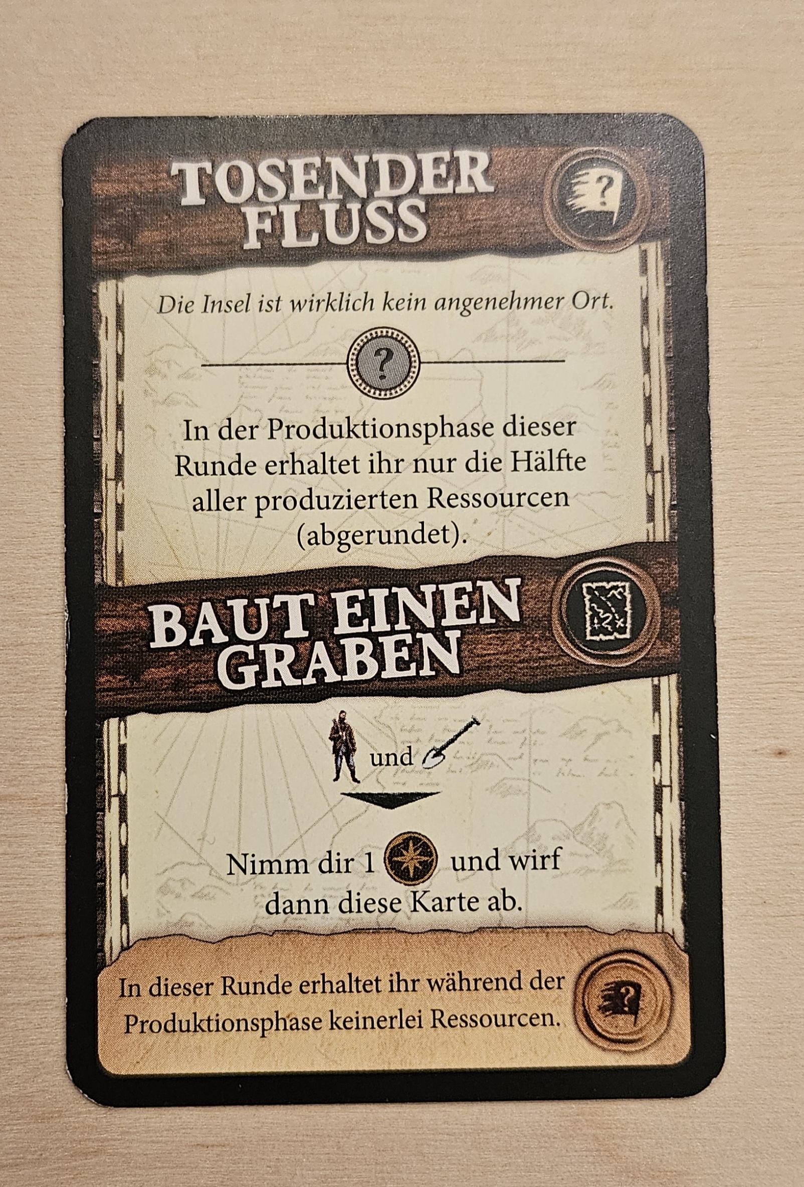 5. WetterphaseAuf dem Wetterfeld liegt ein Regenplättchen. Da wir das Entdeckungsplättchen "Altes Segel" haben, setzen wir dieses ein und erhalten temporär +2 auf unser Dach. Damit wird die Regenwolke "abgewehrt".