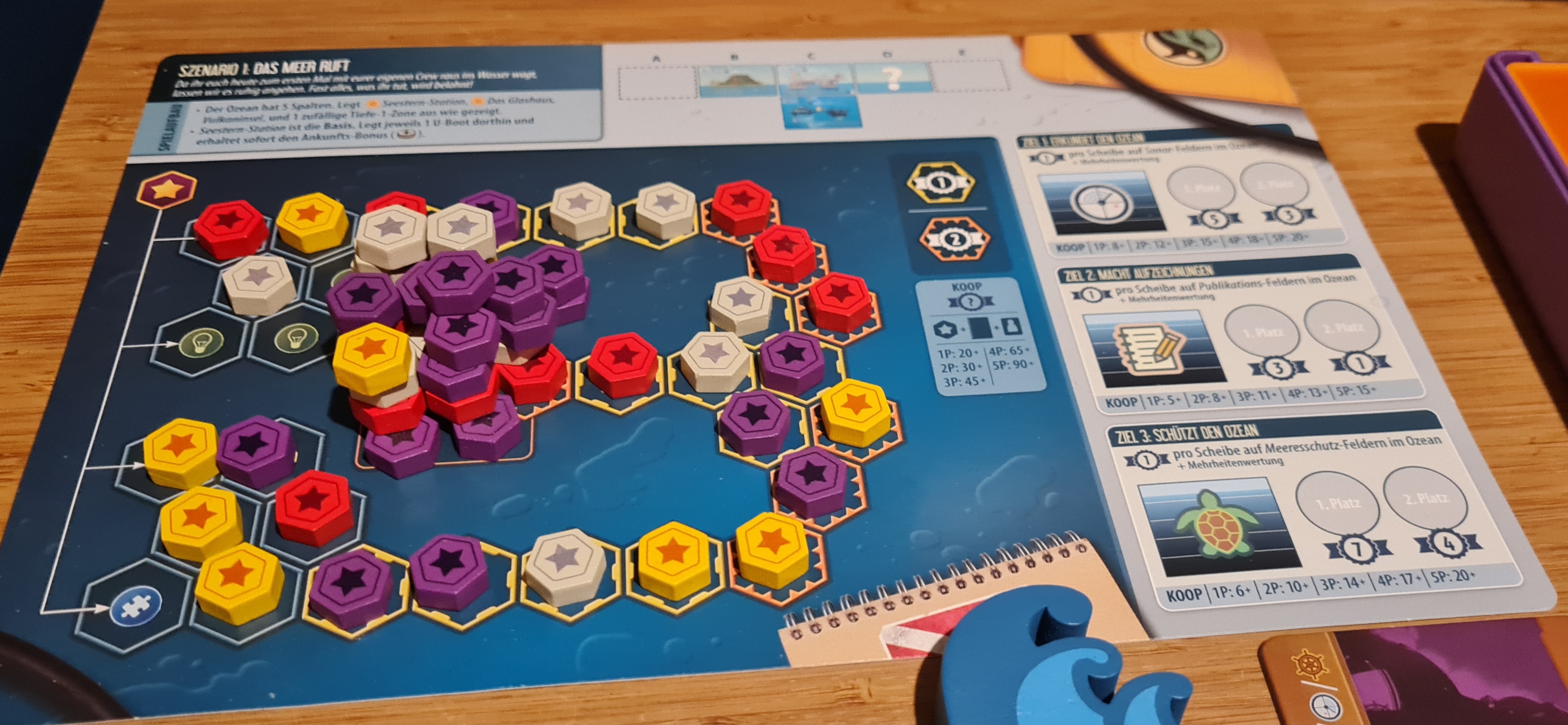 WS: Die Tiefseefilmerin taucht (4W, +1 Stern) an der Gesunkenen Station, danach macht sie für 6W das erste Meeresschutzprojekt an der GS: +1 Organisation, +3 Sterne.