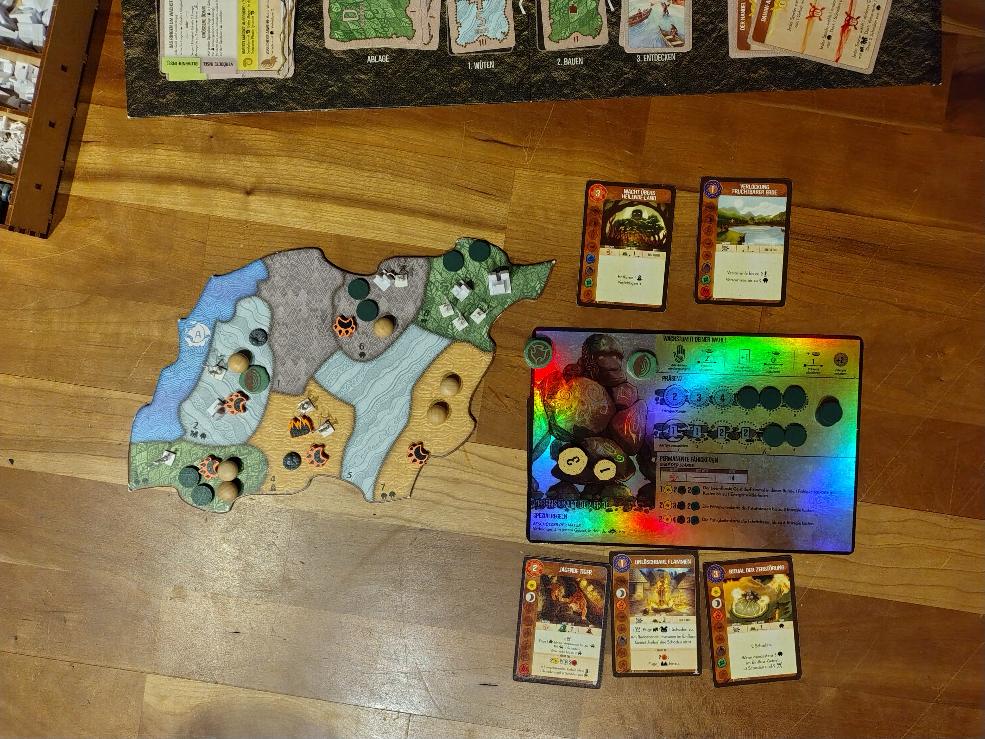 Ob die neuen Ereigniskarten jetzt so viel hilfreicher sind als die alten, kann ich nicht so direkt sagen. Die Dahan-Effekte sind auch auf anderen Karten vorhanden. Ein Effekt, der einfach so eine Bestie auf jeden Spielplan hinzufügt, gab es schon auf einer Katze aus A&T. Die unregelmäßigen Ausbrüche gibt es ebenfalls, lediglich das zerstörte Ökosystem, das eine Einöde in ein Gebiet mit Ödnis hinzugefügt, ist neu. Finde ich aber jetzt nicht zu stark oder so, auch andere Effekte machen mal ein bisschen Schaden. Auch die Plättcheneffekte finde ich also ganz normal. Die zugezogenen Siedler (1. EK) sind quasi Schottlands Eskalationseffekt. Nicht wirklich hilfreich. Die weit entfernten Kriege ersetzten eine Karte, die in deinem Spiel bereits vorkomm. Ich weiß nicht, wie genau die hieß, aber im Endeffekt hat sie in einem Küstengebiet Schaden an Land und Invasoren in Höhe der Kosten einer zufälligen starken Fähigkeit gemacht (aus A&T). Die wurde regebalanced, weil die ursprüngliche Version zu stark war. Wir zerstören also jetzt die Hälfte der Gebäude für 2 Ödnis anstatt dass wir für eine Ödnis 2-9 Schaden machen. Nicht schlecht, aber weniger hilfreich, als die alte Karte. Die letzten Karte kostet jeden Geist entweder eine Präsenz und eine Energie oder erlaubt es, eine Karte (keine starke Fähigkeit) gratis auszuführen, wenn man diese vergisst und seine Hand ablegt. Auch eher negativ, wenn man nicht zufällig vorhat, seine Hand im nächsten Zug aufzunehmen.