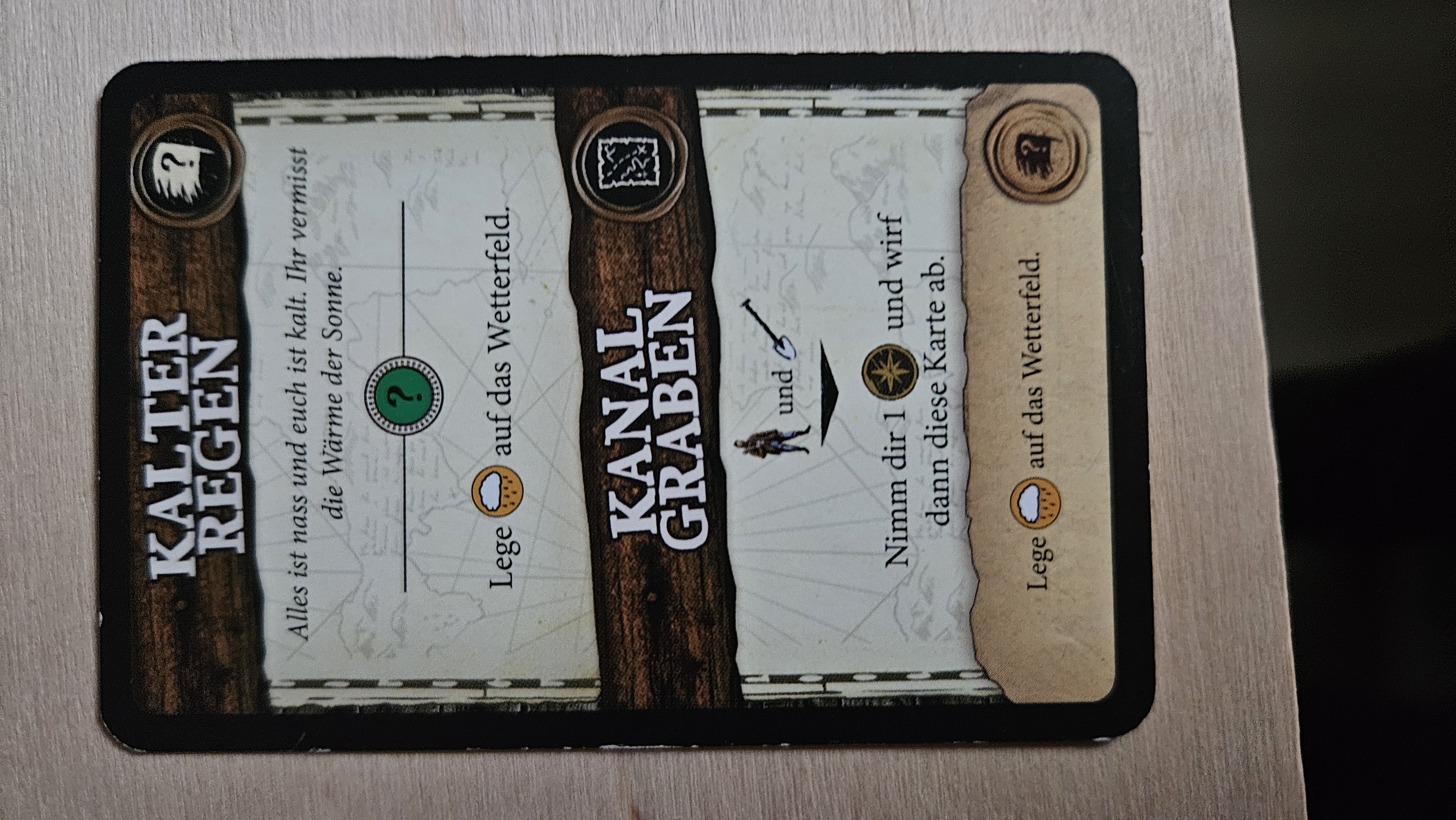 ...mit einem "Sturm" (eine der grauen Abenteuerkarten, die in den Ereignisstapel gemischt wurden). Dadurch wird das Sturmplättchen auf das Wetterfeld gelegt. Wenn wir zur Wetterphase kommen, wird zum einen ganz normal der Regenwürfel geworfen. Zusätzlich müssen wir jetzt auch noch auf einen Sturm achten. Durch den Sturm müssen wir in der Wetterphase unsere Palisadenstärke um 1 verringern. Können wir das nicht, erleiden alle Charaktere 1 Wunde. Aktuell beträgt unsere Palisadenstärke 0.