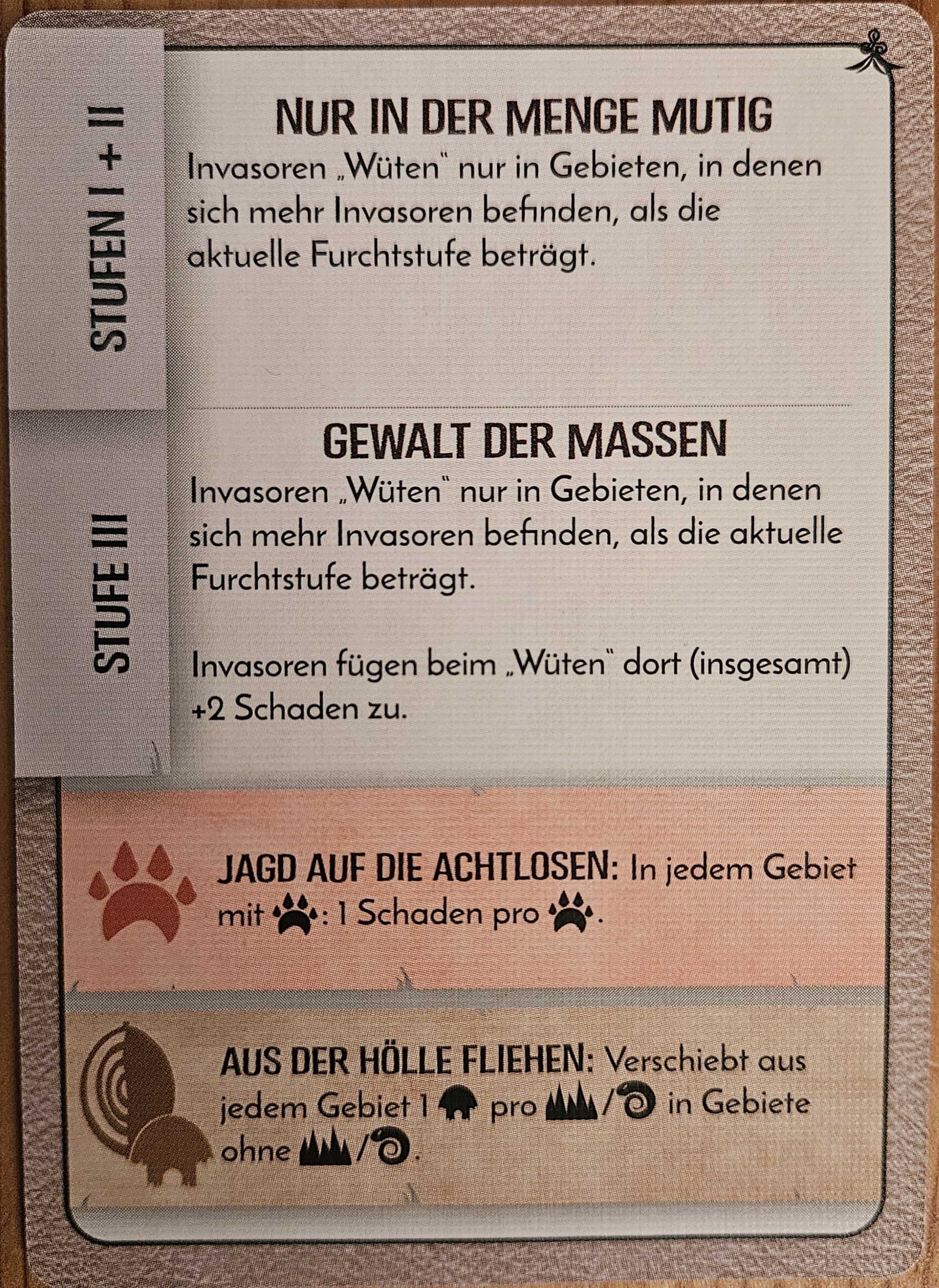 +3 Energie, +1 Tiersymbol, +1 Ödnis von SW3 nach SW4, 3 Karten ausspielen.