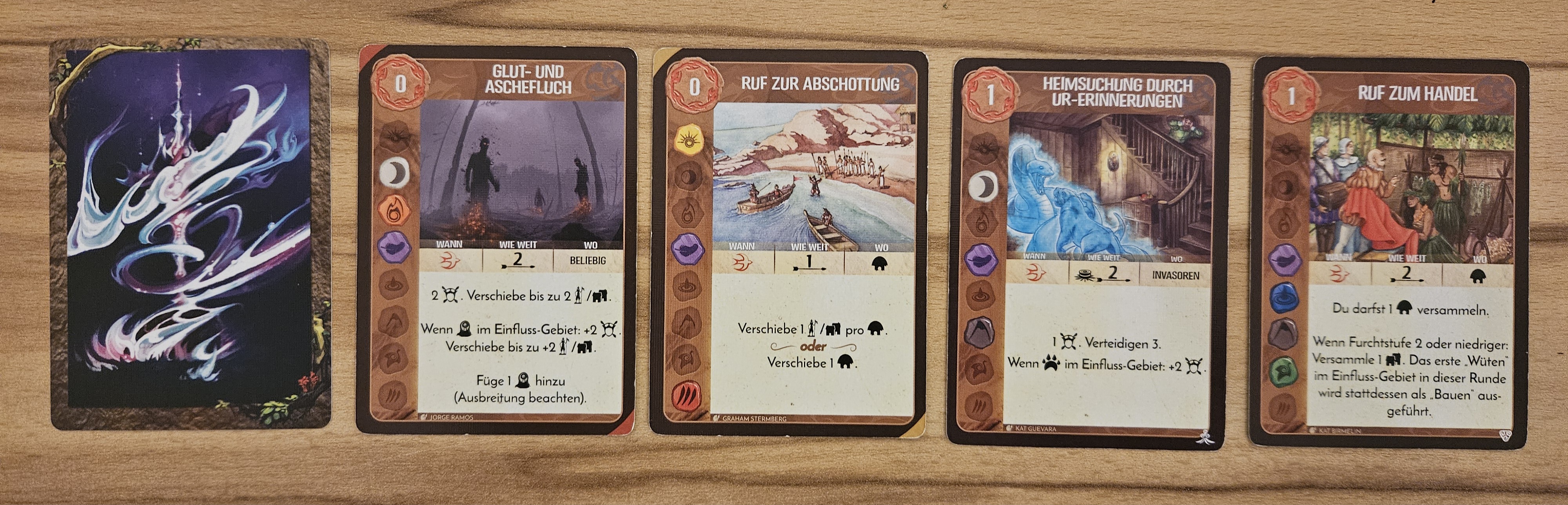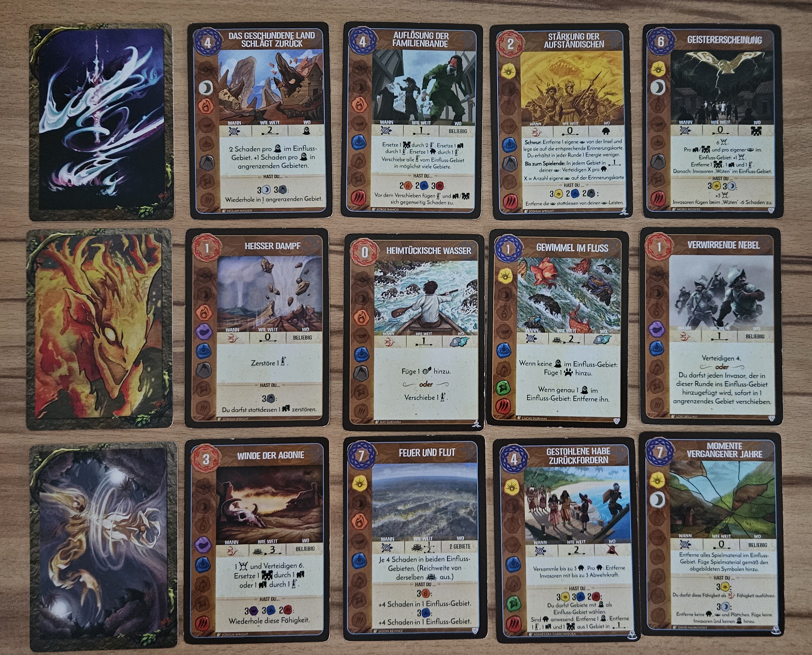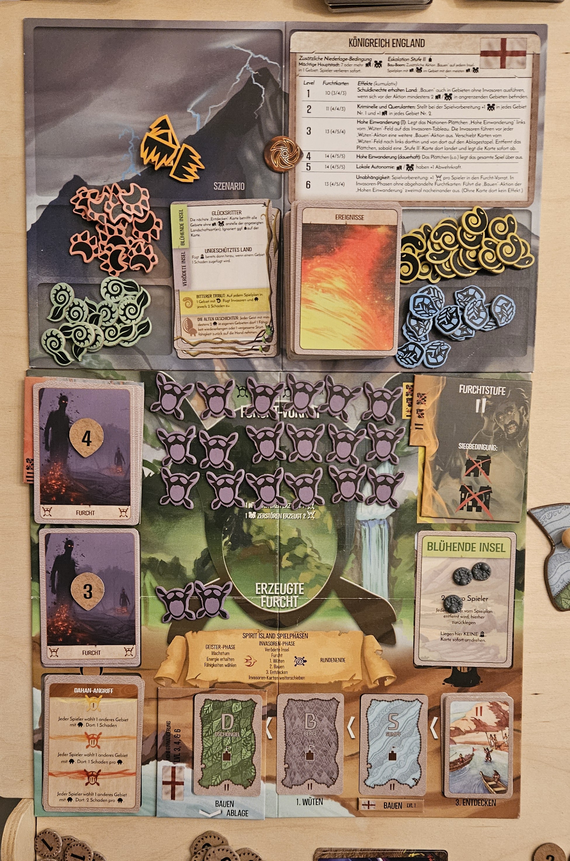 Am Rundenende: dank der Geschichten am Lagerfeuer nehme ich den Elementarschub auf die Hand. Die +1 Energie sollte ich ja schon bekommen haben, da die Dahan ja zum Zeitpunkt des Ausspielens bei meiner Präsenz waren.