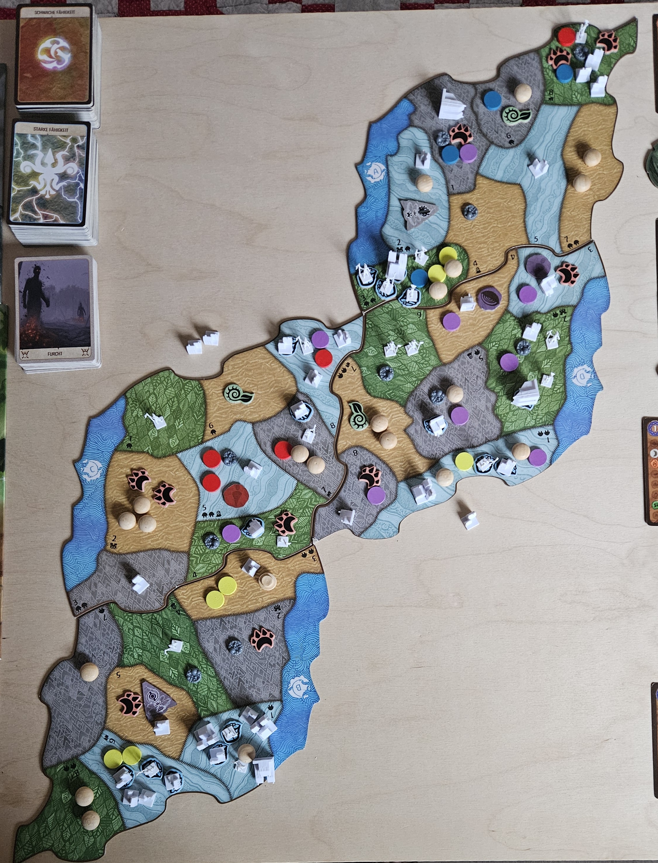Ich wähle ein Einflussgebiet (eines meiner Gebiete, also mit meiner Präsenz), also darf ich mit den Nebelschwaden vorher eine Präsenz von mir versammeln: ich wähle C4, und versammle vorher die Präsenz von C8 nach C7. Ich verschiebe mit der Schreckgestalt das Dorf und den Entdecker von C4 nach C7. Das Dorf hat einen Streitmarker und ist angeschlagen.