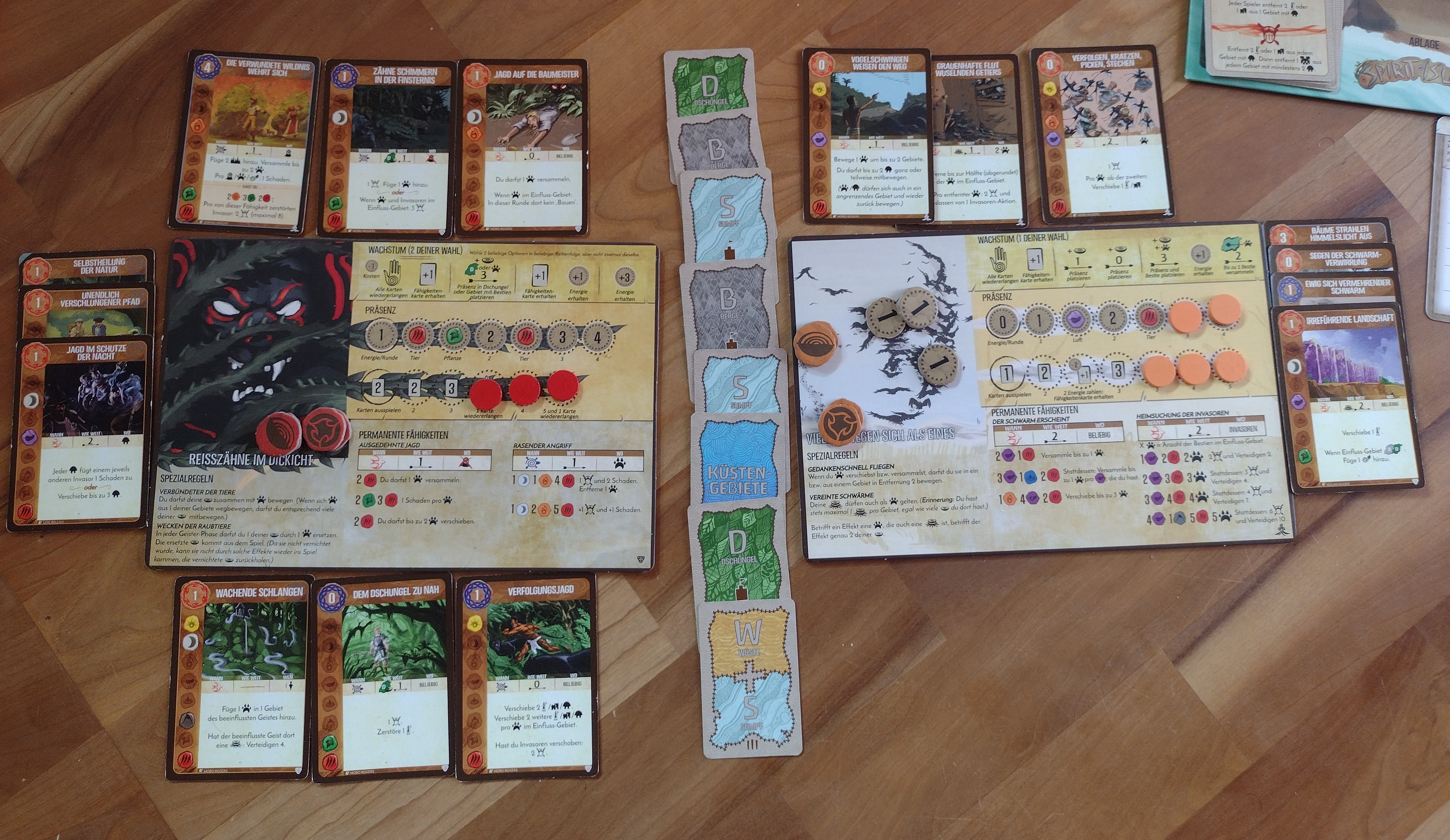 Das spektakuläre Ende dann in Runde 8 will ich kurz zu Papier bringen: Der Schwarm versammelte in ein Gebiet 8 Bestien, um dann vier davon mit der grauenhaften Flut wuselnden Getiers zu vernichten, und 8 Furcht zu erzeugen. Ich hatte mich für einen Furchtsieg als letzten Ausweg entschieden. Auch die Reißzähne leisteten ihren Beitrag, aber es war nicht genug, da die meisten ihrer relevanten Fähigkeiten langsam waren. Also fehlten mir drei Furcht, als ich die Invasorenphase begann. Ich zog mit zitternden Fingern das Ereignis und es kamen: Plünderungen. Nach dem normalen Wüten gibt es noch ein Wüten, in den Gebieten mit den meisten Städten... Eigentlich hätte ich beim Wüten nur eine Ödnis dazubekommen. Da der Plan der Reißzähne beim Wenden der Ödniskarte (zerstörtes Ökosystem) aber ordentlich in Mitleidenschaft gezogen worden war, kamen nun plötzlich 7 Öfnismarker dazu. Auf meiner verödeten Insel lagen noch fünf davon :cry: