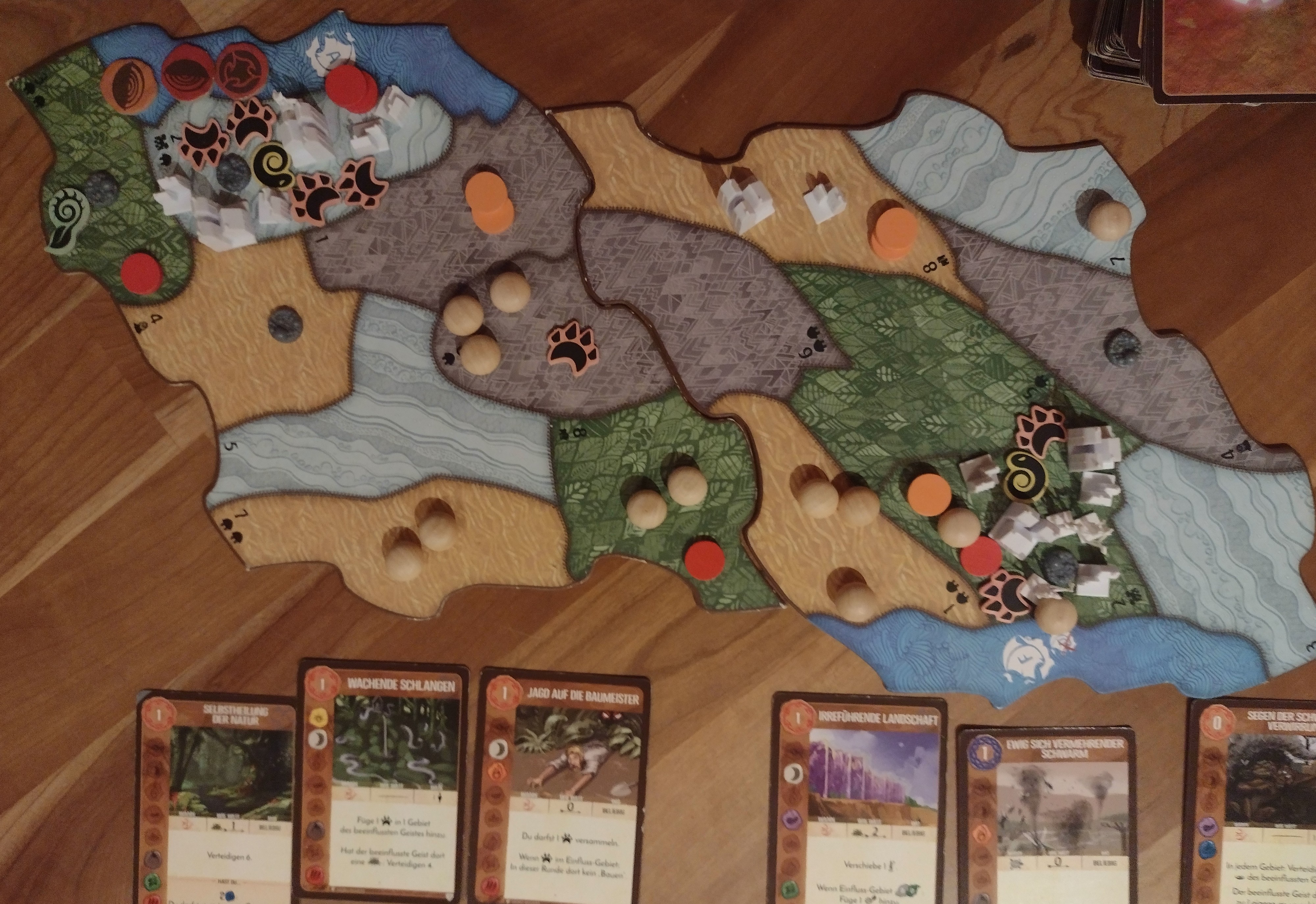 Dann kam die Genickbruchkarte: Lokale Zerstreuung. Als Bau-Karte lagen die Küstengebiete aus. Im Nachhinein sehe ich, dass die Karte nur ein Gebiet und nicht ein Gebiet pro Spielplan beeinflusst, aber gestern Nacht haben sich aus den 2er-Gebieten jedes Spielplans die Dörfer in die anderen Küstengebiete verteilt. So sah der Plan zu Beginn dieser Invasorenphase aus: