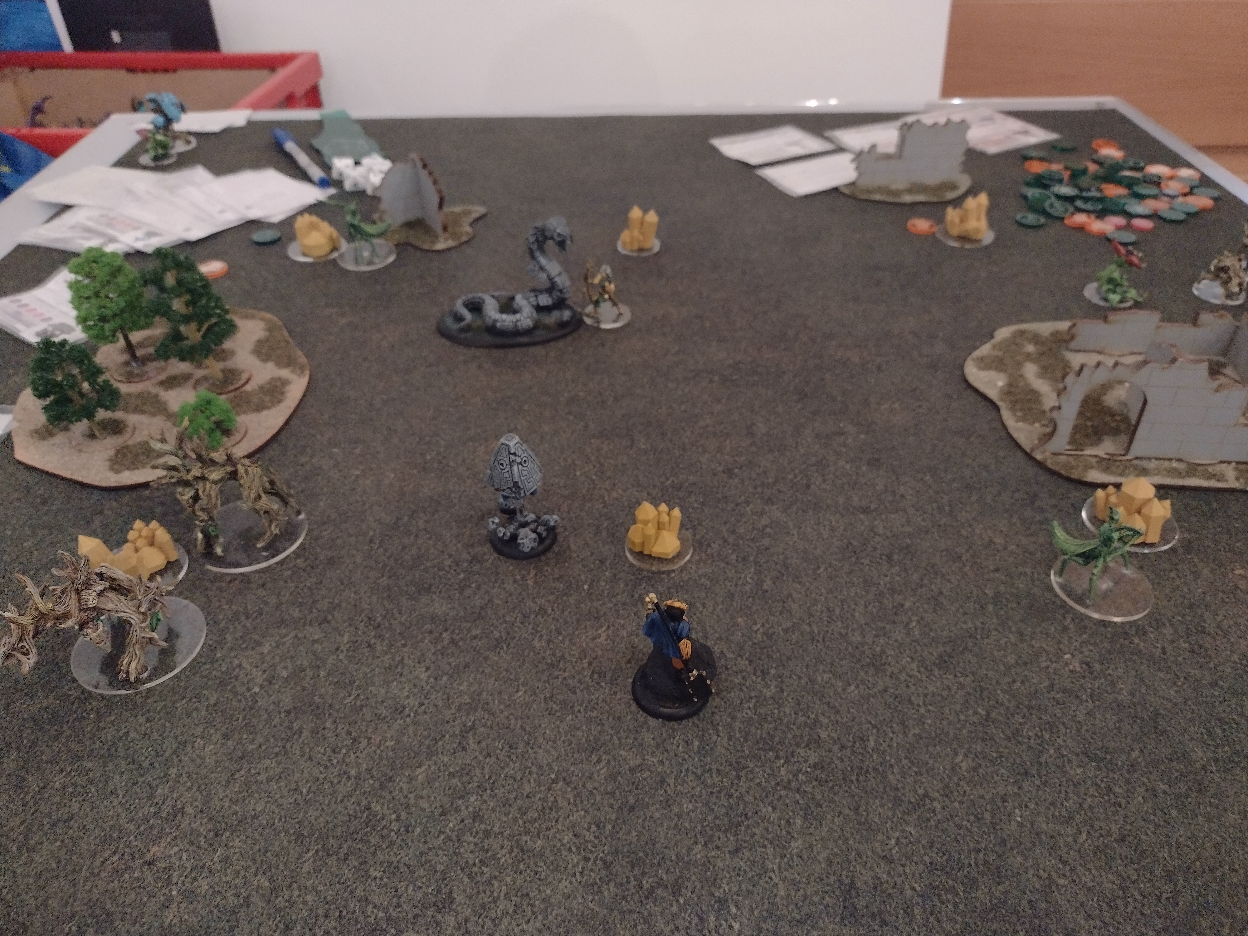 Leider gelingt es meinem Gegner, mir mithilfe eines Zaubers mir die Quelle auf seiner Seite streitig zu machen und dann auch noch mit den zwei Splittern mein Erdelementar in kleine Erdbrocken zu zerlegen. Meine einzige Chance auf einen Sieg war dann, den gegnerischen Beschwörer zu töten, was mir 5 Punkte geben würde, wodurch ich genau mit einem Punkt Vorsprung gewinnen würde. Also beschwor ich meine Schlange, die sich in Position bringen sollte und dann den Beschwörer in Runde 6 frontal angriff. Das waren insgesamt 8 Angriffswürfel, wobei der gegnerische Beschwörer nicht reagierte, er hatte noch volle Lebenspunkte und das reichte ihm, um zu überleben...