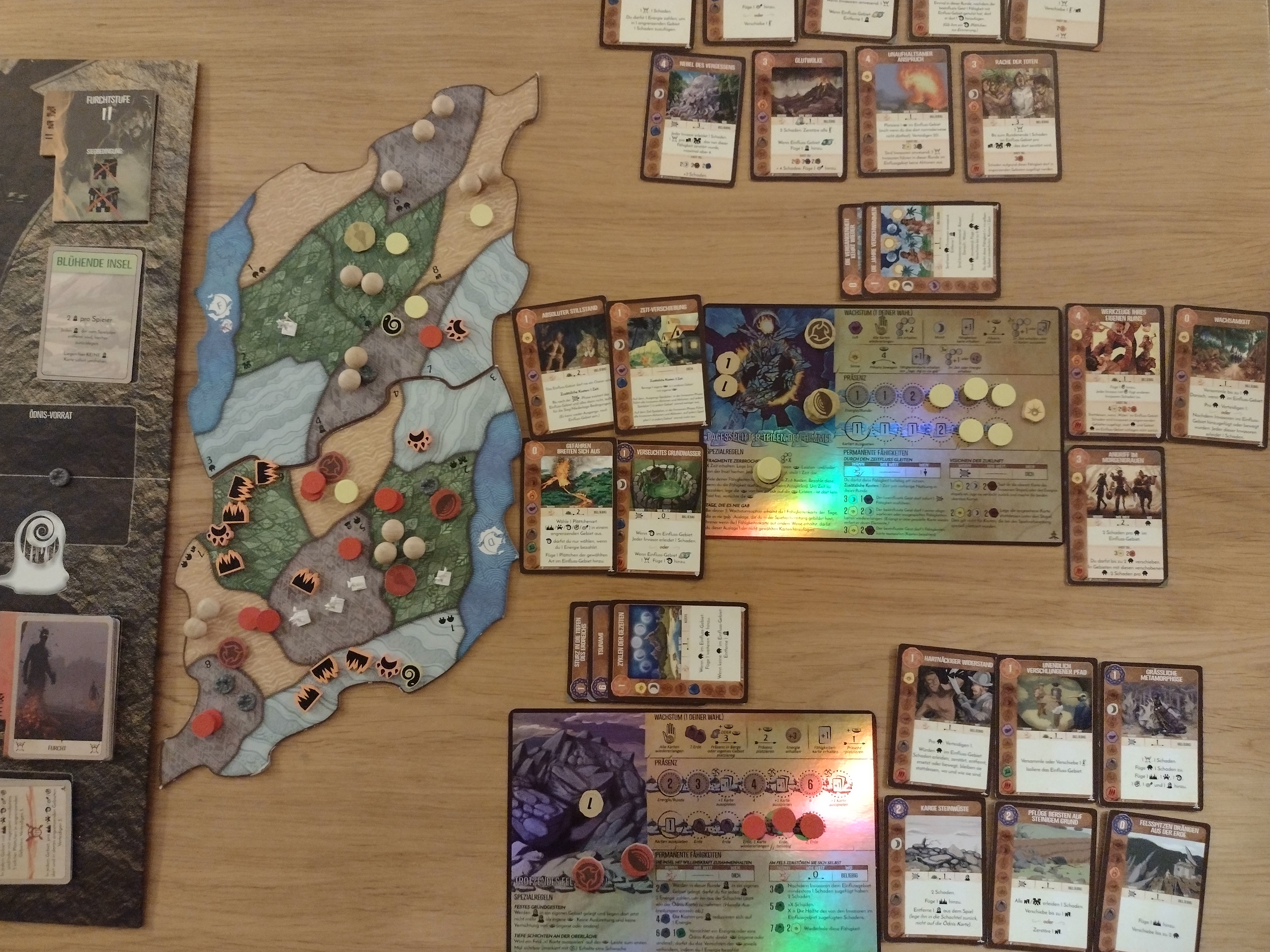 Zu den Tagessplittern bei Spirit Island: Ja, die sind natürlich auch sehr davon abhängig, welche Fähigkeiten in den Tagen, die nie waren, liegen und wie gut sie zusammenpassen. Und natürlich können sie extrem gut unterstützen, allerdings sind sie auch sehr von Hilfe abhängig. Gerade, weil sie kaum Präsenzen selbst auf die Insel bringen, sondern sich in ihrem eigenen Mini-Game verlieren. Sehr komplex zu spielen, und ich glaube, noch ein bisschen mehr als alle anderen Geister auch vom Glück abhängig, was sie gerade zur Auswahl haben und ob das passt oder nicht.