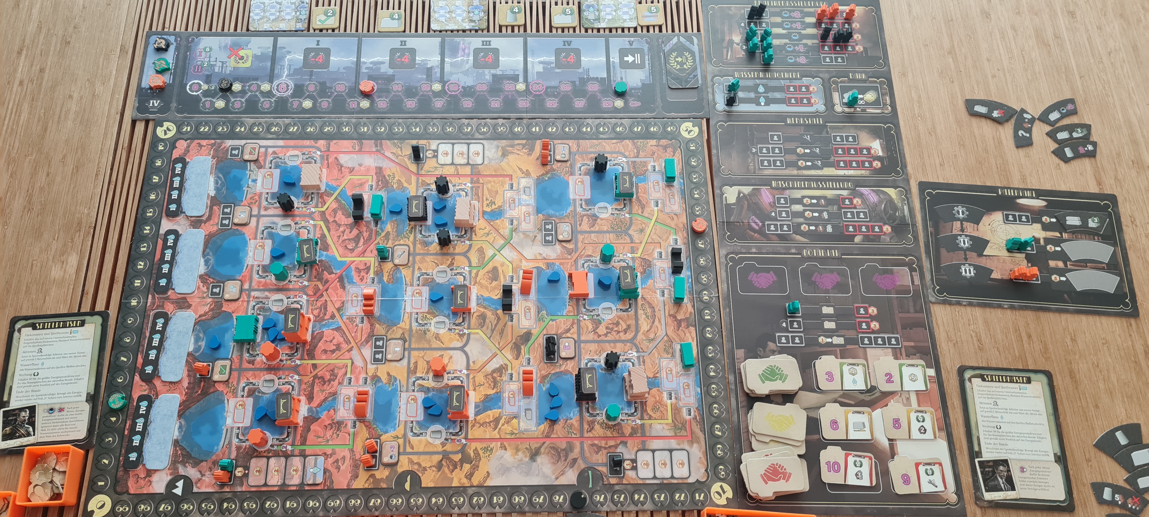 Da baute ich mir Wasserkraft auf, mit dem Colorado Spielplan, und spielte eine 3-Spieler-Partie mit Deutschland, Italien und den Niederlanden. Und ja, ich war vielleicht etwas geschwächt, sicher nicht multi-playing-fähig, und lustigerweise verpatzte ich mit den Niederlanden den Start, mit Italien das Mittelspiel, und mit Deutschland komplett das Endspiel. Und wie sich herausstellte, der Start war am wenigsten schlimm, weil die Niederlande gewannen mit gewaltigen Vorsprung, während Deutschland nach dem fulminanten Sieg Ende Juni am Nil-Delta dieses Mal in den Rockys komplett abgehängt wurden.