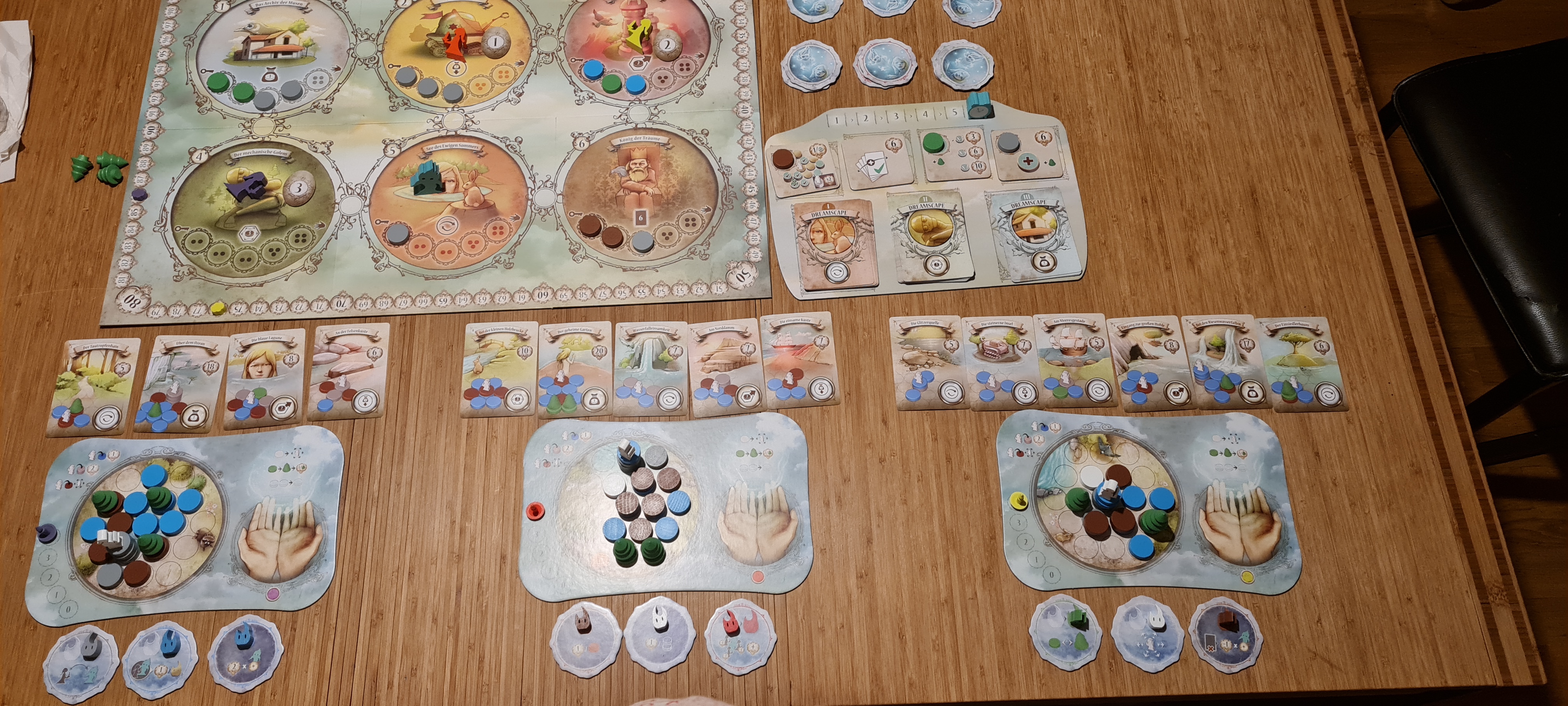 Und gestern habe ich, aufgemuntert dank der vielen begeisterten Videos auf YT zu Harmonies das große Vorbild, Dreamscape, wieder hervorgekramt und Regeln studiert und gespielt. Einmal nur das Grundspiel, dann einmal mit der Schneemann-Erweiterung, und abends dann mit der Irlicht Erweiterung. Und was soll ich sagen? Dreamscape hat wieder bewiesen, dass ich es zurecht weit über Harmonies stelle, es ist ein großartiger Hirnverzwirbler, wie man in nur 6 Runden möglichst viele Traumbilder in seiner Traumlandschaft nachstellen kann, und ja, wenn man von den suboptimalen Texten der Erweiterungen Abstand nimmt passen sich diese wunderbar in das Spiel ein und betonen den märchenhaft schönen Charakter des Spieles noch einmal zusätzlich.