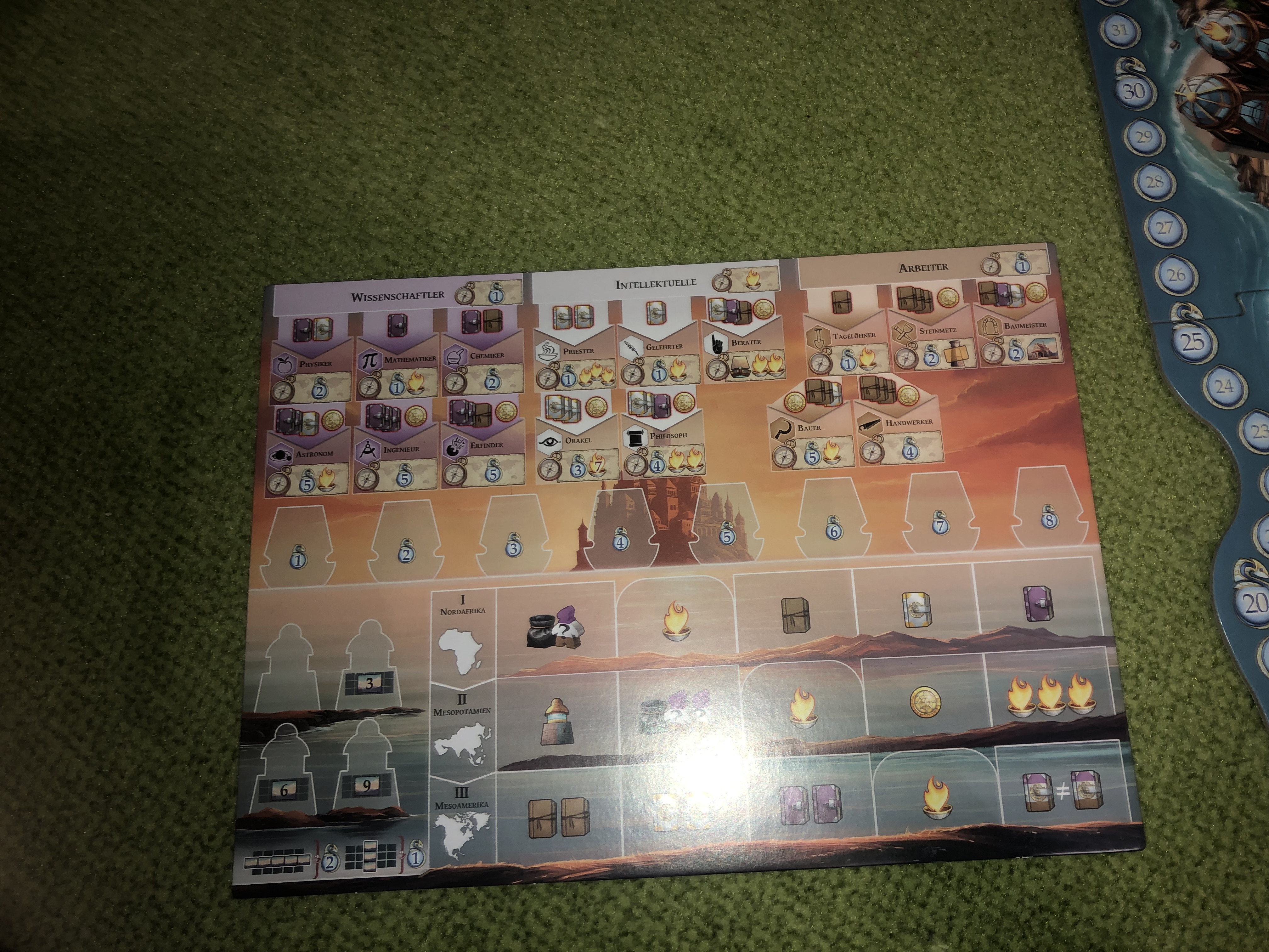 Dies ist ein Spielertablo. Wenn man Siedler erhält erkennt man an der Farbe ob sie Wissenschaftler, Interlektuelle oder Arbeiter sind. Im Zug bewegt man sich jede runde in Atlantis und kann dann 2 von 5 Aktionen ausführen. (Es kann auch eine 2x gemacht werden.) Z.B. kann man Siedler ausbilden indem man bestimmte Bücher und Geld abgibt, z. B. kann man einen Intellektuellen zu einem Priester ausbilden, wofür man zwei weiße Bücher benötigt. Dadurch erhöht sich die Belohnung fürs siedeln von einer Flamme zu 3 Flammen und einem Punkt. Eine weitere der 5 Aktionen ist es einen Siedler siedeln zu schicken. Dann versetzt man ihn in den Siedlungsbereich. Um es kurz zu halten komme ich jetzt zum Spielplan.