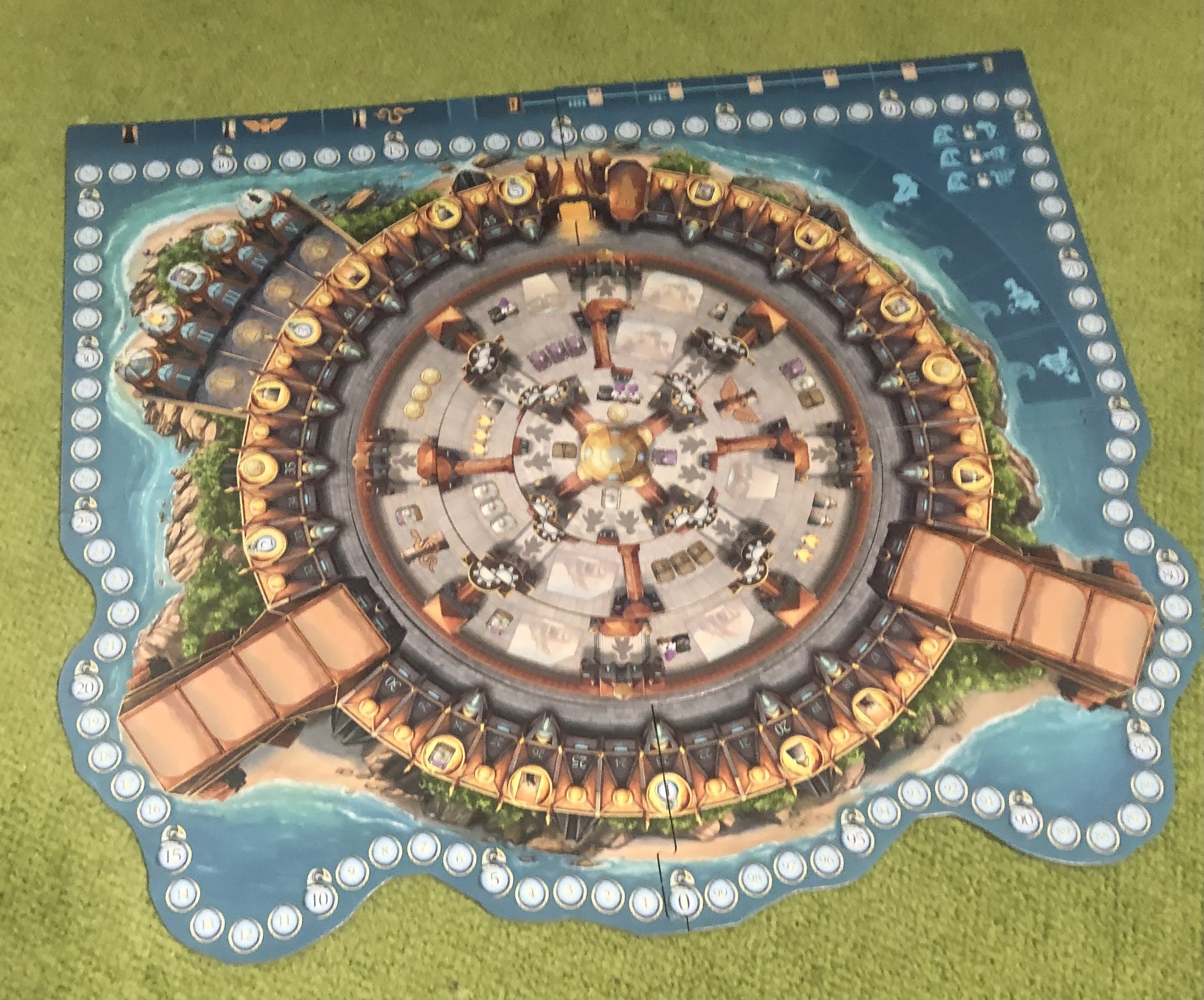 Der Spielplan zeigt außen eine Punkteleiste und etwas weiter innen die Apotheosisleiste, wo man Belohnungen durchs Weiterkommen erhält. Man zieht dort pro Flamme die man bekommt ein Feld vor. Im Zentrum hat man das dreiteilige Atlantis-Stadtrondel, welches sich nach Ablauf jedes der 5 Jahre verdreht. Im ersten Zug des Jahres stellen die Spieler ihre (Königs-)Figur auf eines der vier Felder. Dann erhalten sie die darauf liegenden Siedler und die abgebildeten Belohnungen. Im zweiten Zug gehen sie auf die mittlere Stufe, dabei kann man an Treppen, aber nicht an Mauern vorbei und der dritte Zug führt dann in die Unterste Ebene. Es gibt noch viele weitere Mechaniken aber das ist das grundlegende.