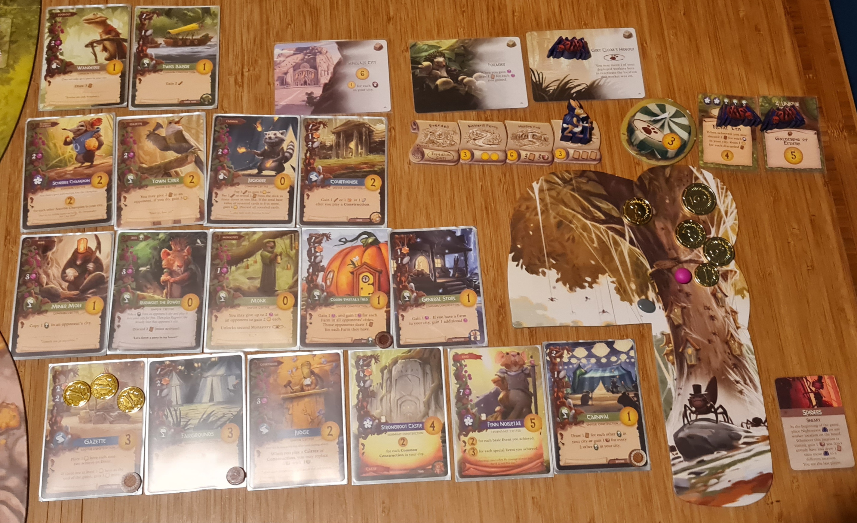 An dieser Stelle kann ich auch noch einen kurzen Everdell-Bericht nachreichen. Am 31.12. spielten wir eine Partie mit unserer "Lieblingskombination", bestehend aus dem Grundspiel, Bellfaire und Spirecrest plus die Legendary Cards sowie die Tickets und die neuen Handkarten aus Newleaf. Es traten an die Frettchen gegen die Starlings.