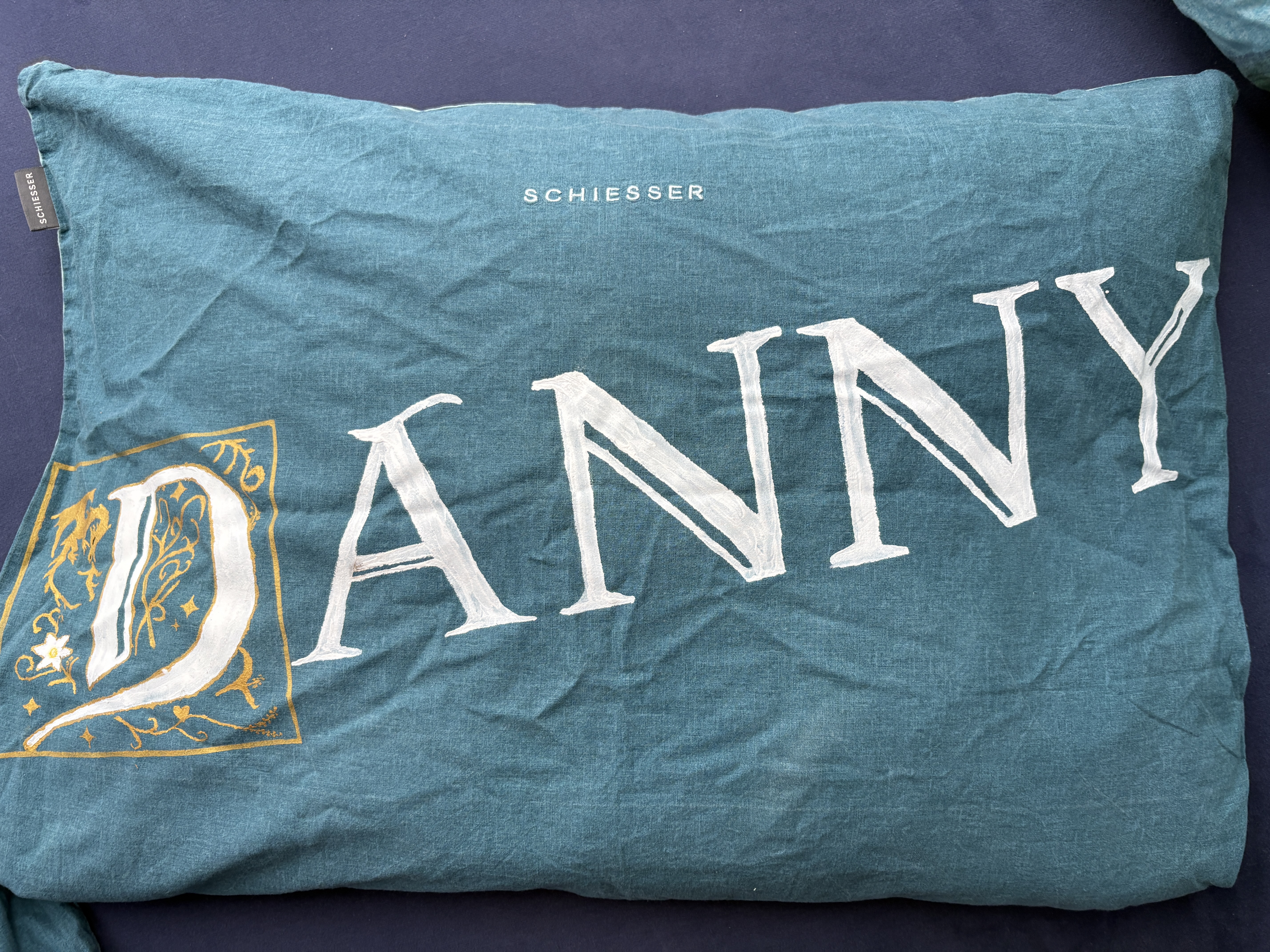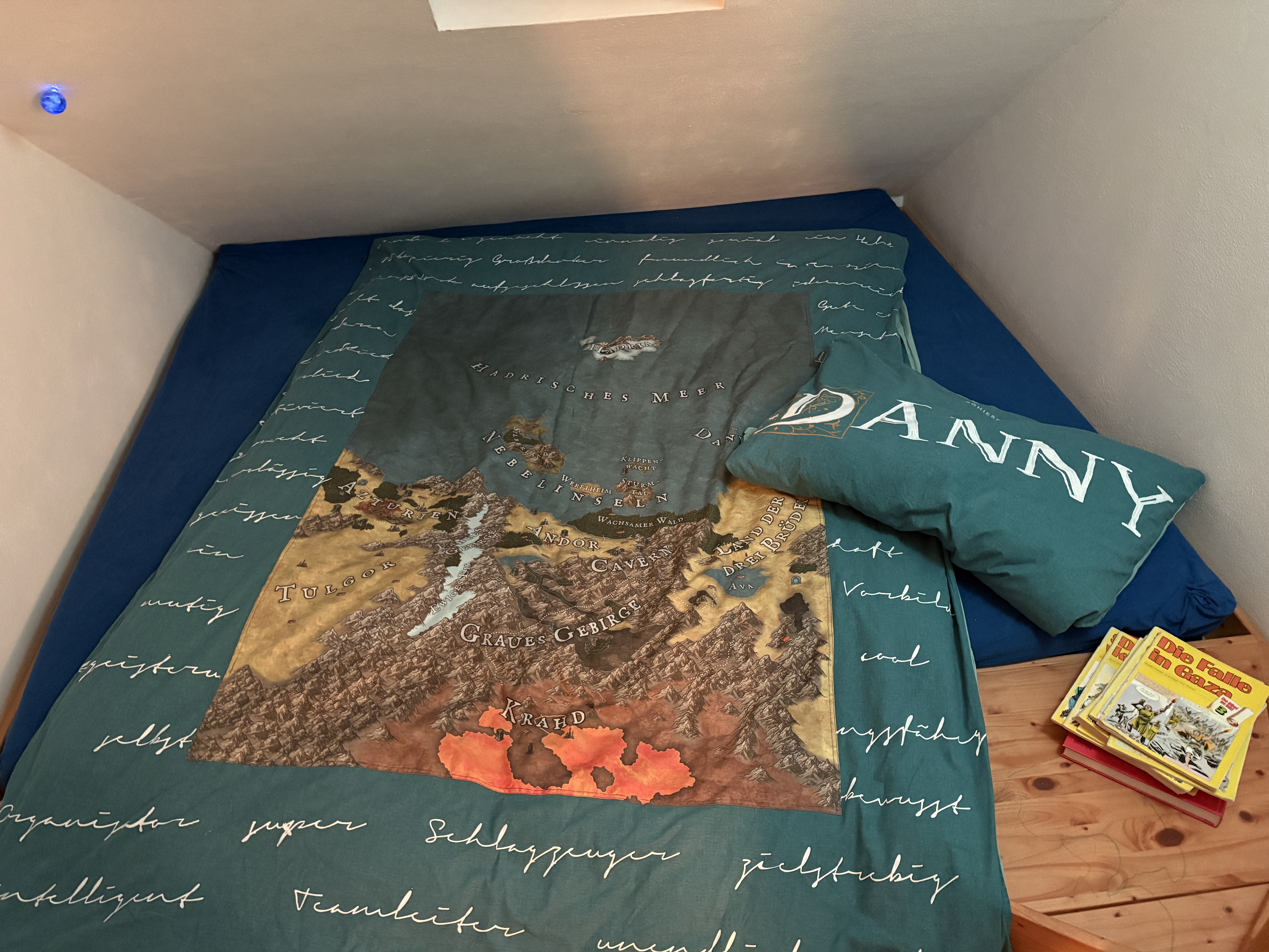Ich war davor Abende lang am überlegen und versuchen, wie ich diese Landkarte gut auf diese Bettdecke bekomme. Habe schon einen Beamer ausgeliehen und installiert, um mir eine Vorlage zu projizieren. Das wäre aber nicht so gut gewesen:-)