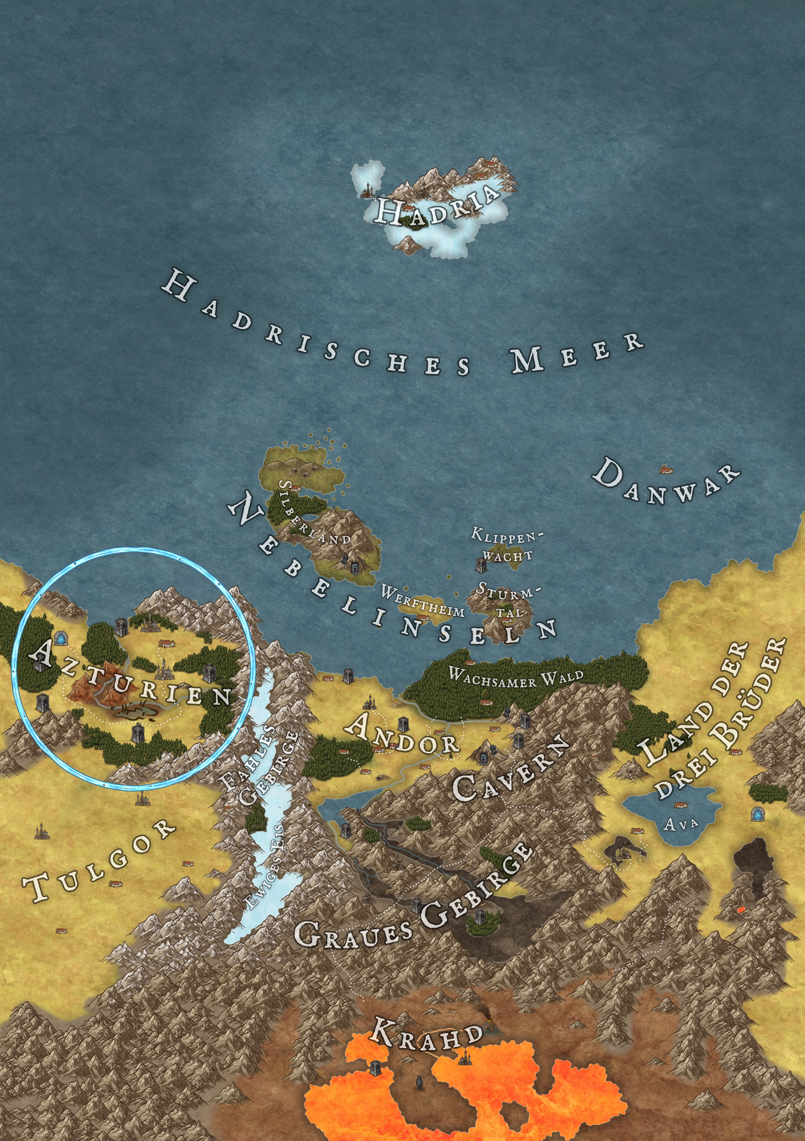 Die hier schon näher diskutierte Landkarte des fernen Landes Azturien ist vor einigen Wochen pünktlich zum Start des Fan-Legenden-Wettbewerbs 2026 erschienen. Nun kam ich endlich dazu, die hiesige Fan-Gesamtkarte entsprechend zu überarbeiten: