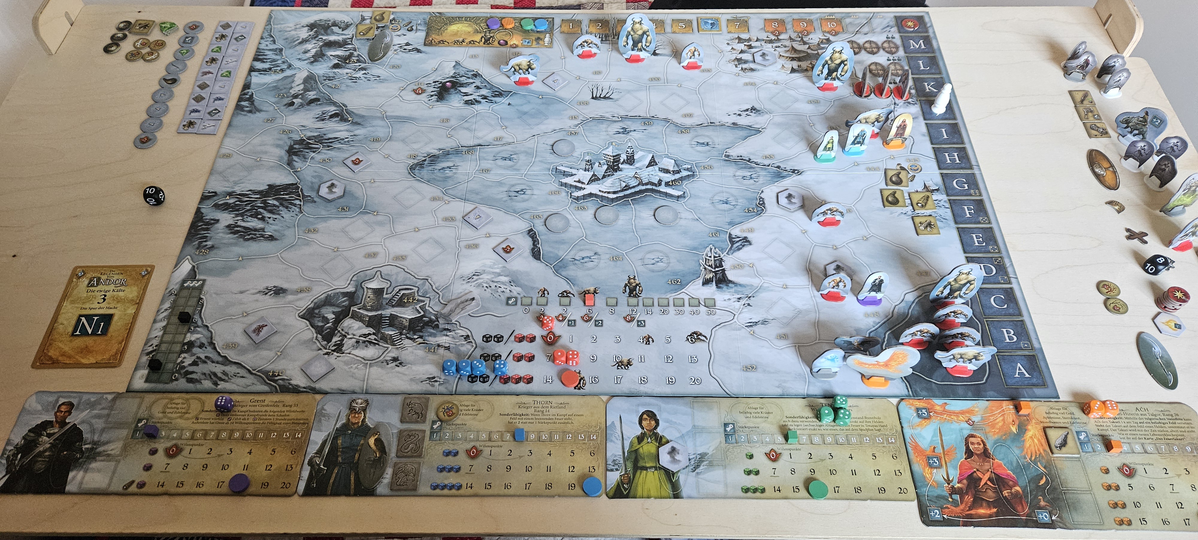 - Grent setzt seine Überquerung des Sees fort, doch bemerkt auf Feld 462, dass ihm der Schneesturm dicht auf den Fersen ist. (6.h) Aćh und Tenaya werden um ein Feld versetzt. Aćh landet dadurch in der Zeltstadt und übergibt die Blaubachbeeren sowie beide Tafeln an Thorn.