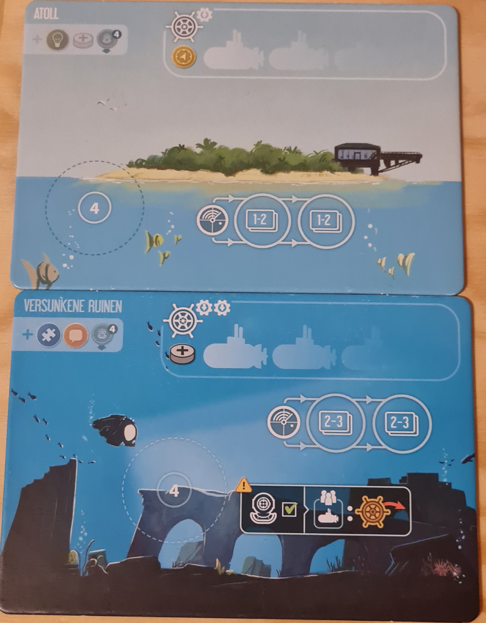 3: Sonar. Das Schallwellensymbol zeigt an, dass man eine zusätzliche Scheibe auf einem passenden Sonarfeld auf einer Kachel einsetzen darf, auf der ein eigenes U-Boot steht. Danach kann man sich den abgebildeten Bonus nehmen, oder zwei verdeckte Kacheln der abgebildeten Stufen ziehen (falls die Zahlen dortstehen). Eine davon wählt man aus, die andere legt man verdeckt unter den Stapel der jeweiligen Stufe. Man bekommt sofort den Entdeckungsbonus links oben, wenn man die Kachel passend anlegt.