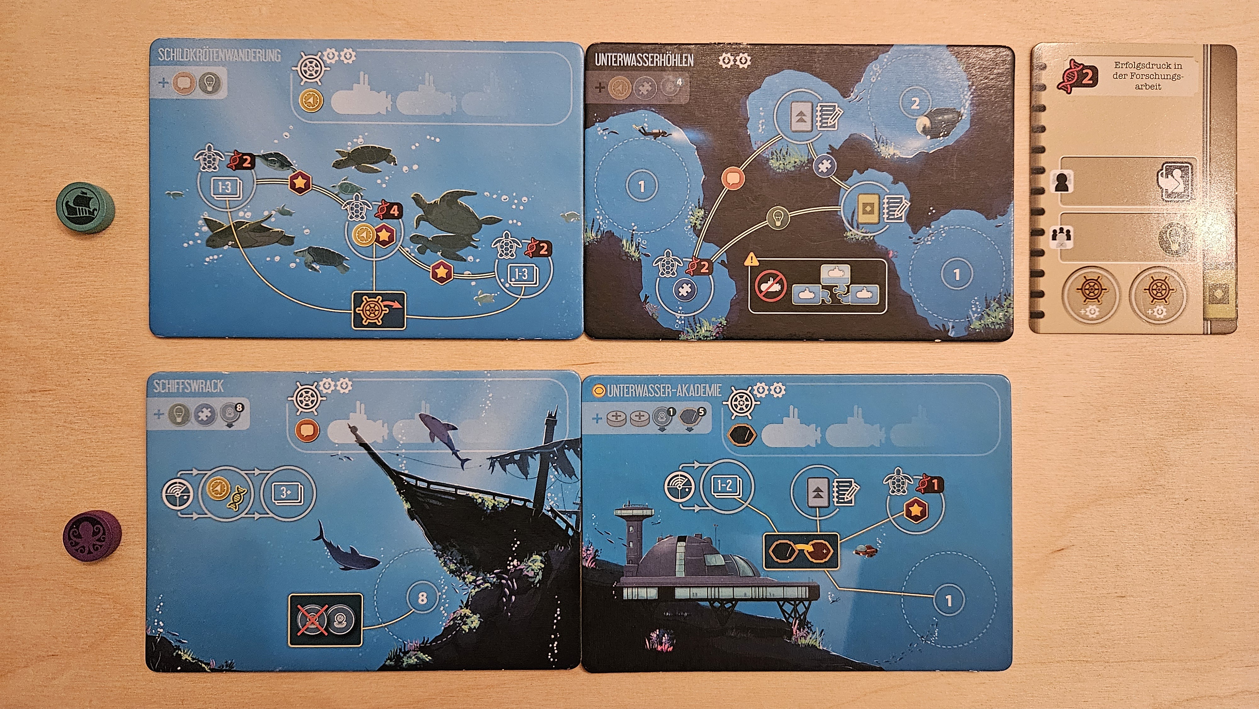 Argonauten kümmern sich bei den Schildkröten erneut um Meeresschutz. -2 Wissen und zwei Tafeln Tiefe 2 aufgedeckt. Der Einflussmarker wandert auf +1 Scheibe (und +1 SP). Durch die Versorgungskapseln in Spalte B erhalten sie +1 Organisation und +1 Genialität.