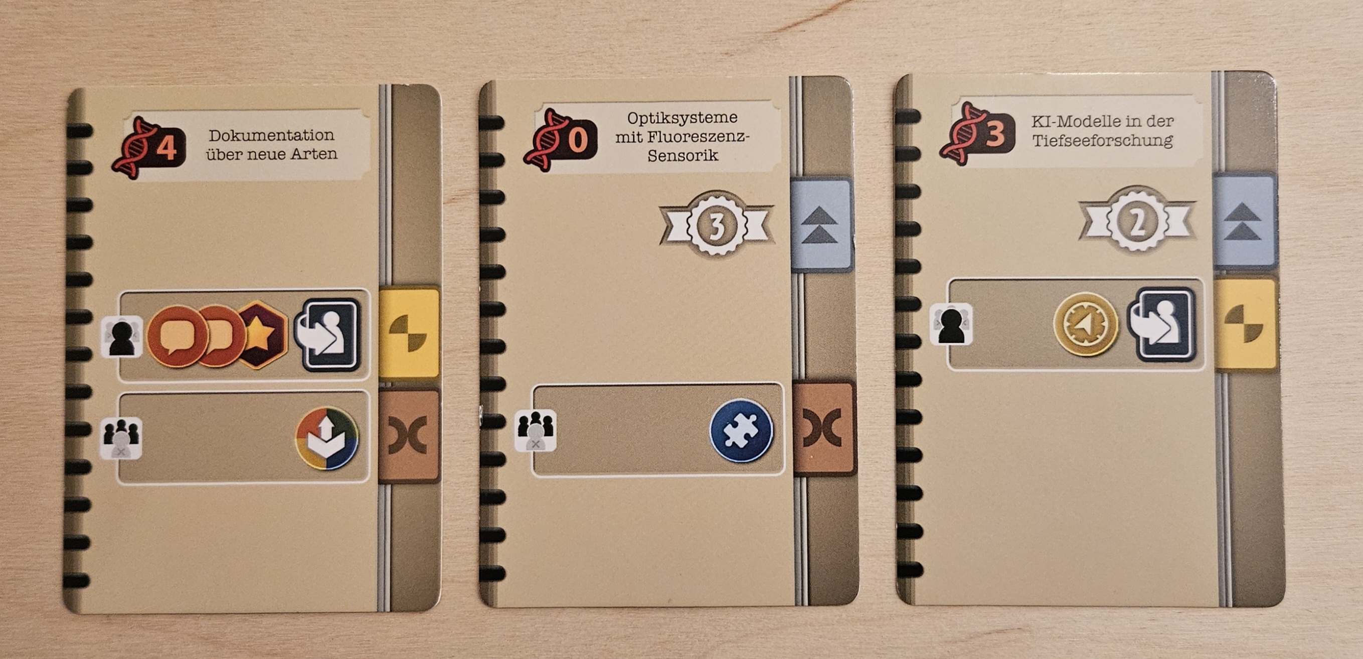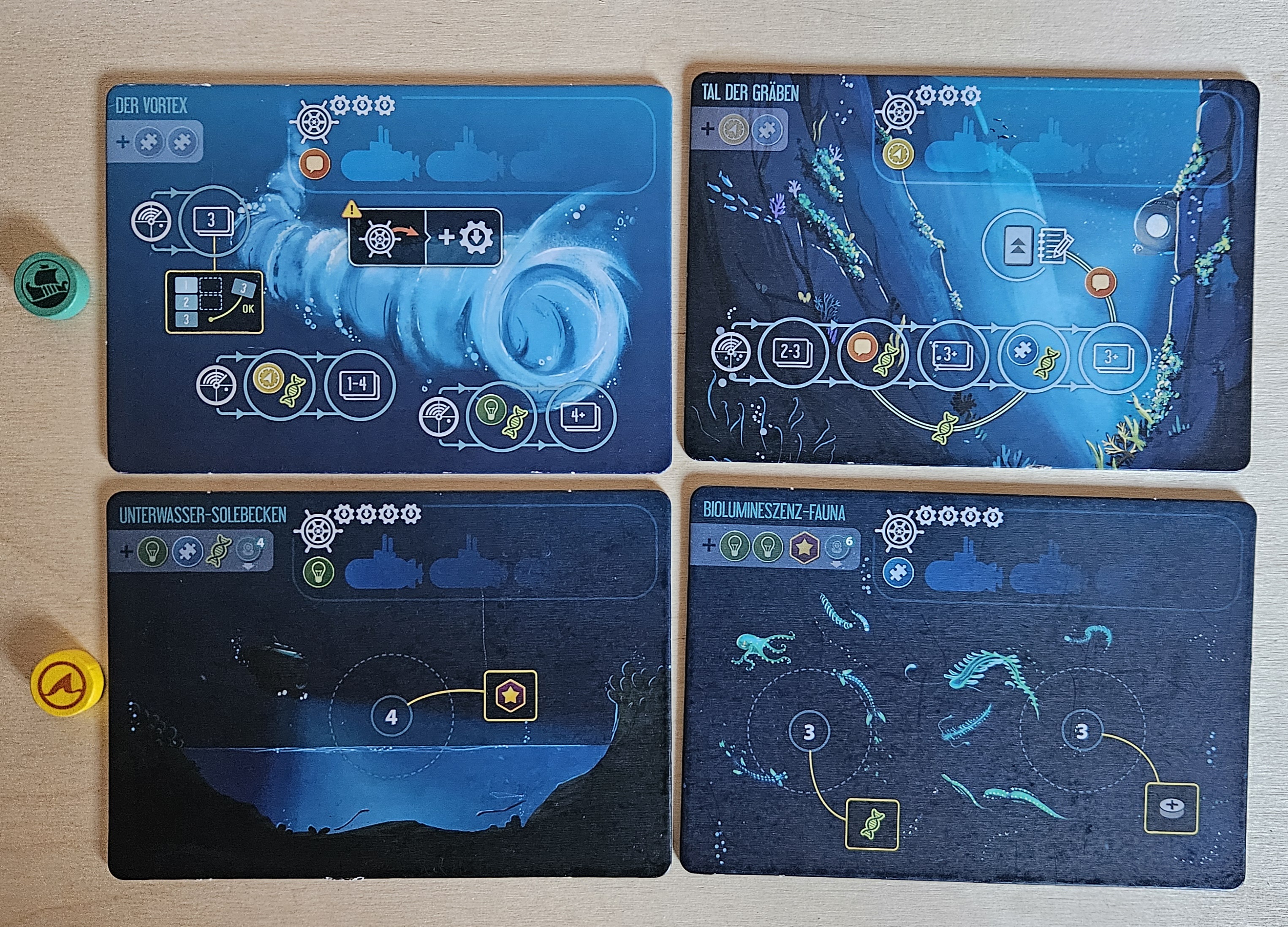 - Die Wasserschimmer GmbH heuert eine Ozeanografin an, die +1 auf alle Eigenschaften bringt. Dann gleiches Spiel: 3 Scheibe aus dem Vorrat und 3 Scheiben zurück. Lediglich der Navigator behält seine Scheibe. Am Ende sind es wie bei den anderen beiden Crews insgesamt 6 Scheiben, die sie im Laderaum haben.