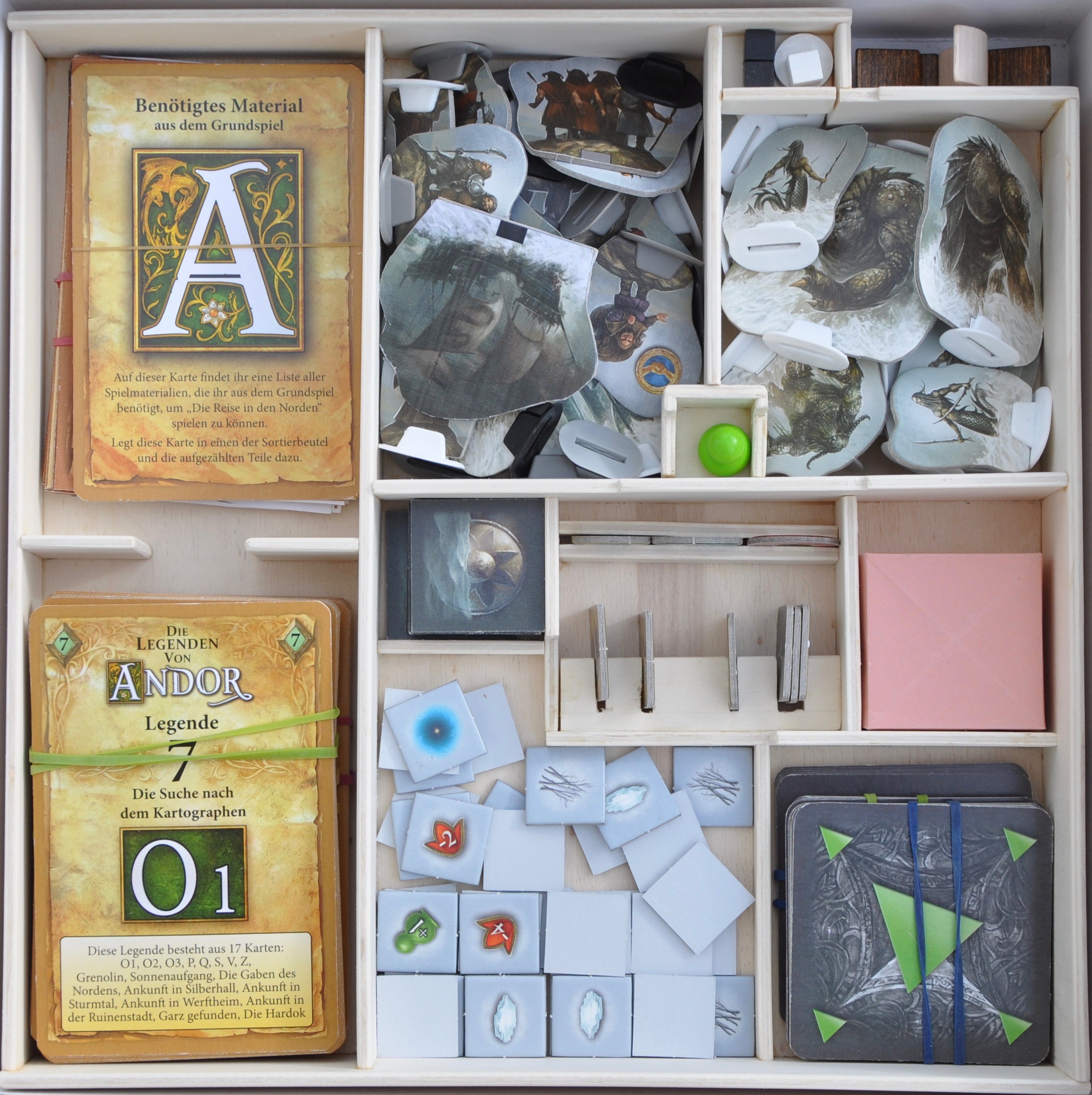 schon seit längerem beschäftige ich mich mit der Frage, wie ich meine Andor-Teile am besten sortiere. Deshalb habe ich jetzt ein Inlay für das Grundspiel und für die Reise in den Norden aus Holz gebaut, und weil ich kein passendes Thema gefunden habe, eröffne ich jetzt einfach ein neues. Vielleicht hat ja jemand ein ähnliches Vorhaben wie ich und kann die Bilder als Inspiration nutzen.