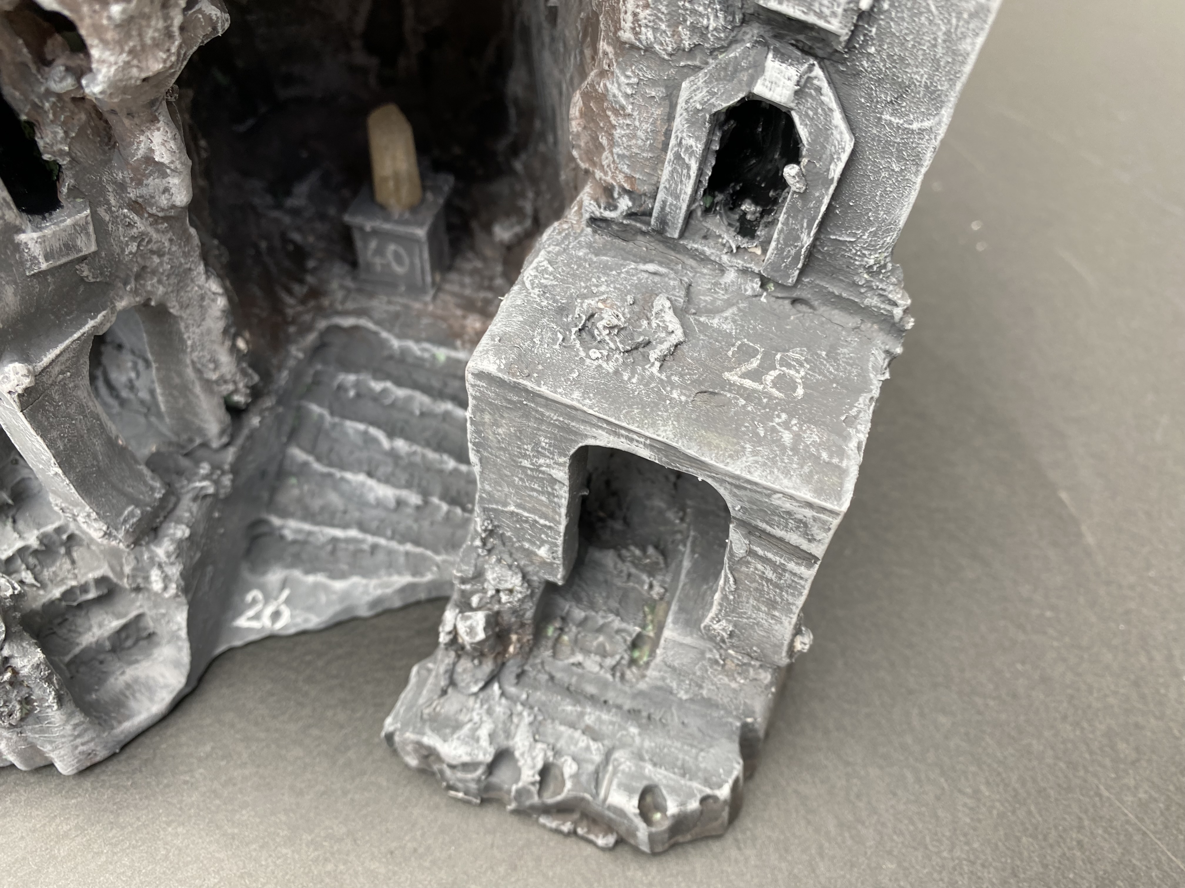 So, wir haben mal wieder ein bisserl April-Regenwetter "verbasteln" müssen und haben uns diesmal an etwas Größeres auf der Cavern-Seite des Spielplans gewagt: Feld 40 "Halle der vier Schilde" und die umliegenden Gebäude. Da wir keine Zwergenstatue zur Hand hatten, seht bei uns ein riesiger Bergkristall auf dem Sockel in der Höhle, den findet Garz bestimmt auch extrem beeindruckend und vielleicht haben die Gors die Statue von Kreatok ja einfach geklaut, sähe ihnen ähnlich. Wenn man eine Taschenlampe dran hält, leutet der Stein auch ganz nett im dramatisch einfallenden Lichtschein ;-)