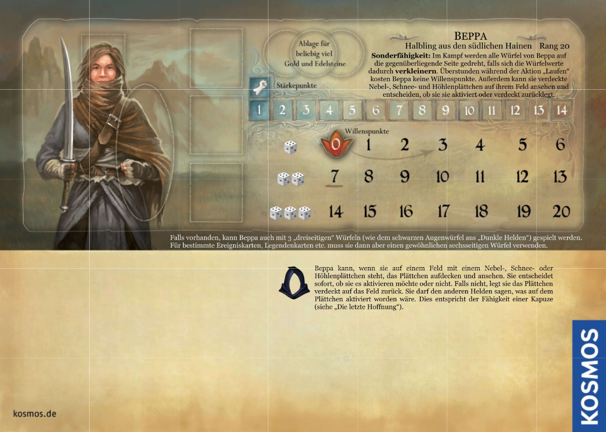 Anmerkung: Der Halbling hat eine zweite Sonderfähigkeit. Er muss nur die Hälfte an Proviant abgeben: Wenn er bei Sonnenaufgang Proviant (Apfelnüsse oder Sternkraut) abgeben kann oder auf dem Feld mit dem Lager/Trosswagen steht, erhält er 1 Sternchen, welches er bei einem späteren Sonnenaufgang als „halben Proviant“ abgeben kann. Nur der Halbling kann Sternchen tragen und bei Sonnenaufgang abgeben.