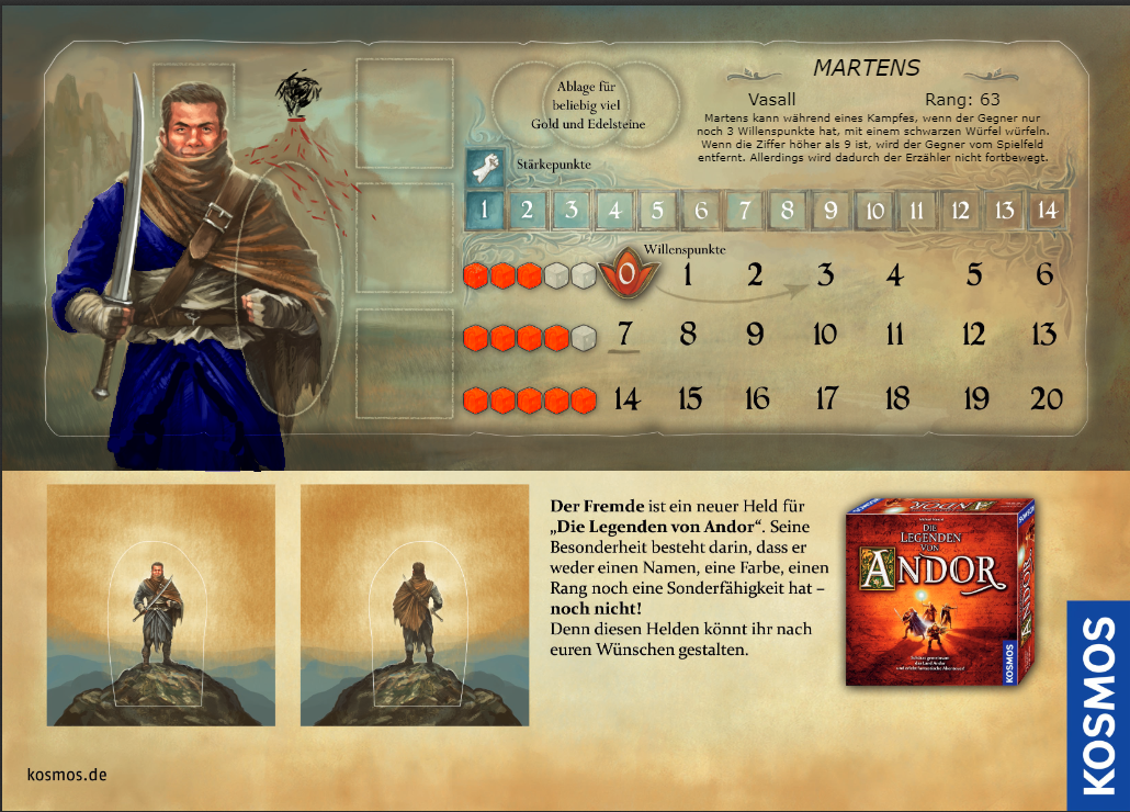 Sonderfähigkeit:Martens kann während eines Kampfes, wenn der Gegner nur noch 3 Willenspunkte hat, mit einem schwarzem Würfel würfeln.