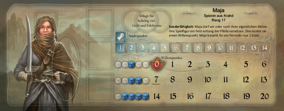 Juan und Maja (meine Helden) sind Spione, daher können sie ein Fernrohr für nur ein Gold kaufen. Sie haben außerdem die Fähigkeit, ihre Spielfiguren vor oder nach ihrer richtigen Aktion ein Feld entlang der Pfeile zu versetzen. Das kostet einen Willenspunkt.