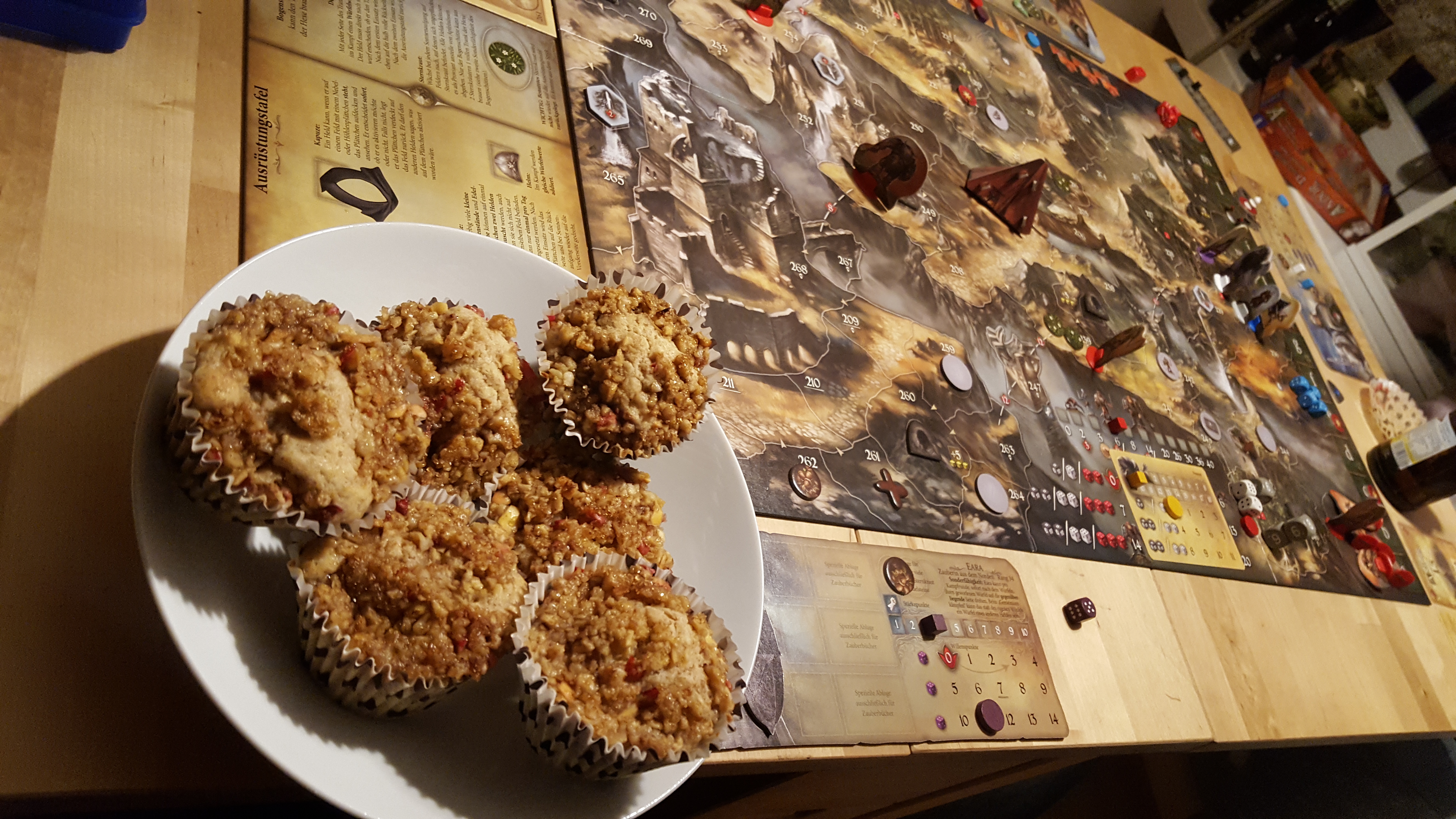 Kulinarisches AndorWir haben uns am heutigen Feiertag (3.10.) in fester Andorrunde zu einer weiteren Legende (Teil 3, Legende15) getroffen und natürlich auch verschieden Speisen zubereitet. Als Nachtisch gab es Apfelnussmuffins. Wir hatten vorher nicht darüber nachgedacht wie passend dieser Nachtisch eigentlich war.