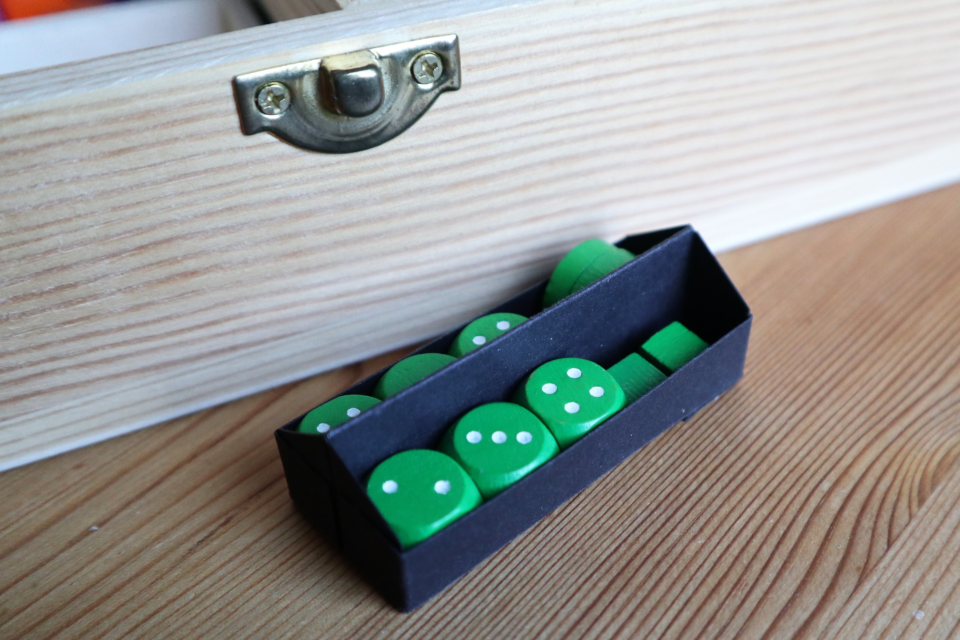 - Darin sind unter anderem auch Kästchen für die je zusammengehörigen Würfel, Plättchen und Steine.