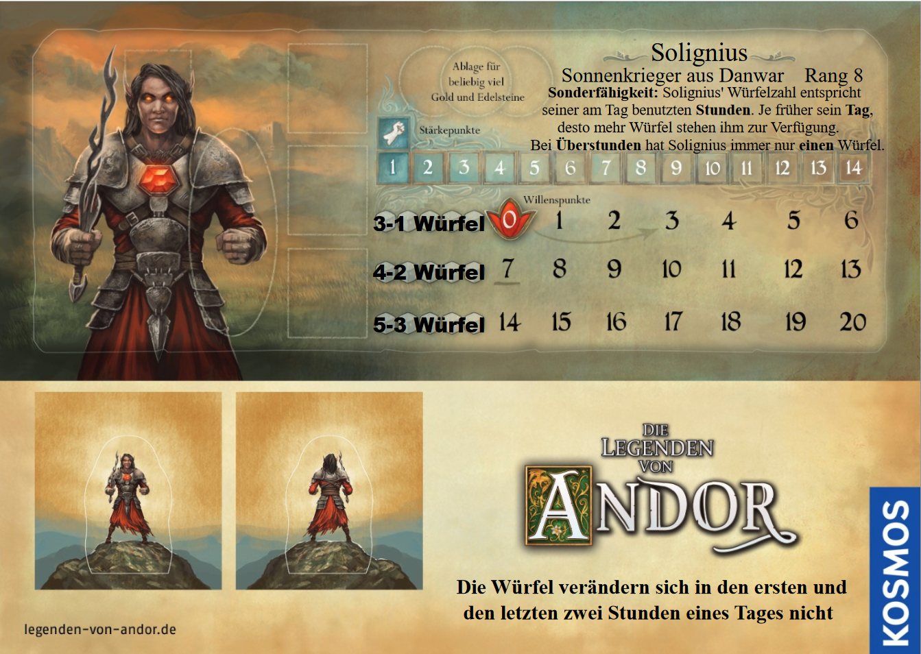Solignius profitiert stark von Gegenständen, die ihm freie Bewegung schenken, wie dem Trinkschlauch oder den Heilkräutern, da sie ihm wertvolle Stunden sparen können. Andererseits kann es sein, dass er - sollte ein Kampf mehrere Runden dauern - Würfel mit und mit einbüßen muss, obwohl er keine Willenspunkte verloren hat. Um sein maximales Potential entfalten zu können, müssen die Spieler also gut vorausplanen können, was mir und bestimmt einigen anderen Spielern besonders viel Spaß bereitet.