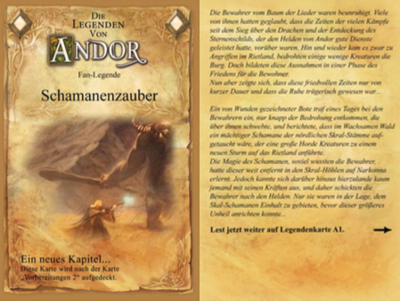 Vielleicht noch kurz etwas zu der Angabe auf der Karte "Vorbereitungen 1", dass die Legende auf eine Begegnung im Spiel "Befreiung der Rietburg" basiert. Dabei geht es lediglich um die Figur des Skral-Schamanen, die in dem Spiel (in Kartenform) vorkommt. Es ist für die Legende nicht nötig, dass Spiel zu besitzen oder gespielt zu haben.