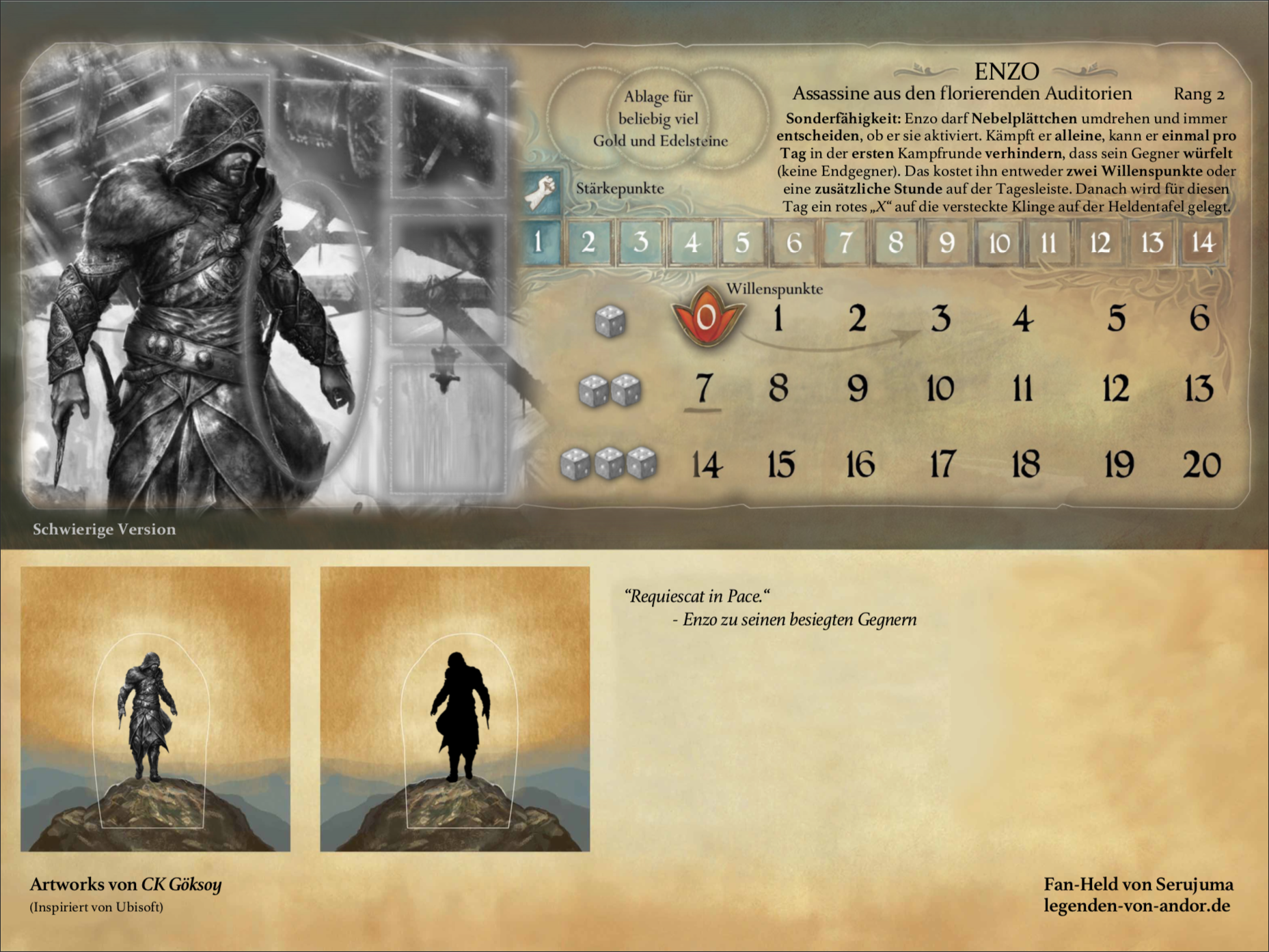 Ich habe drei Varianten von Enzos Heldentafel gemacht. Zwei normale und eine etwas schwierigere Version, bei der Enzo beide Eindämmungen seiner Sonderfähigkeit hat. (Je nach Feedback kann ich auch weitere Varianten erstellen.)